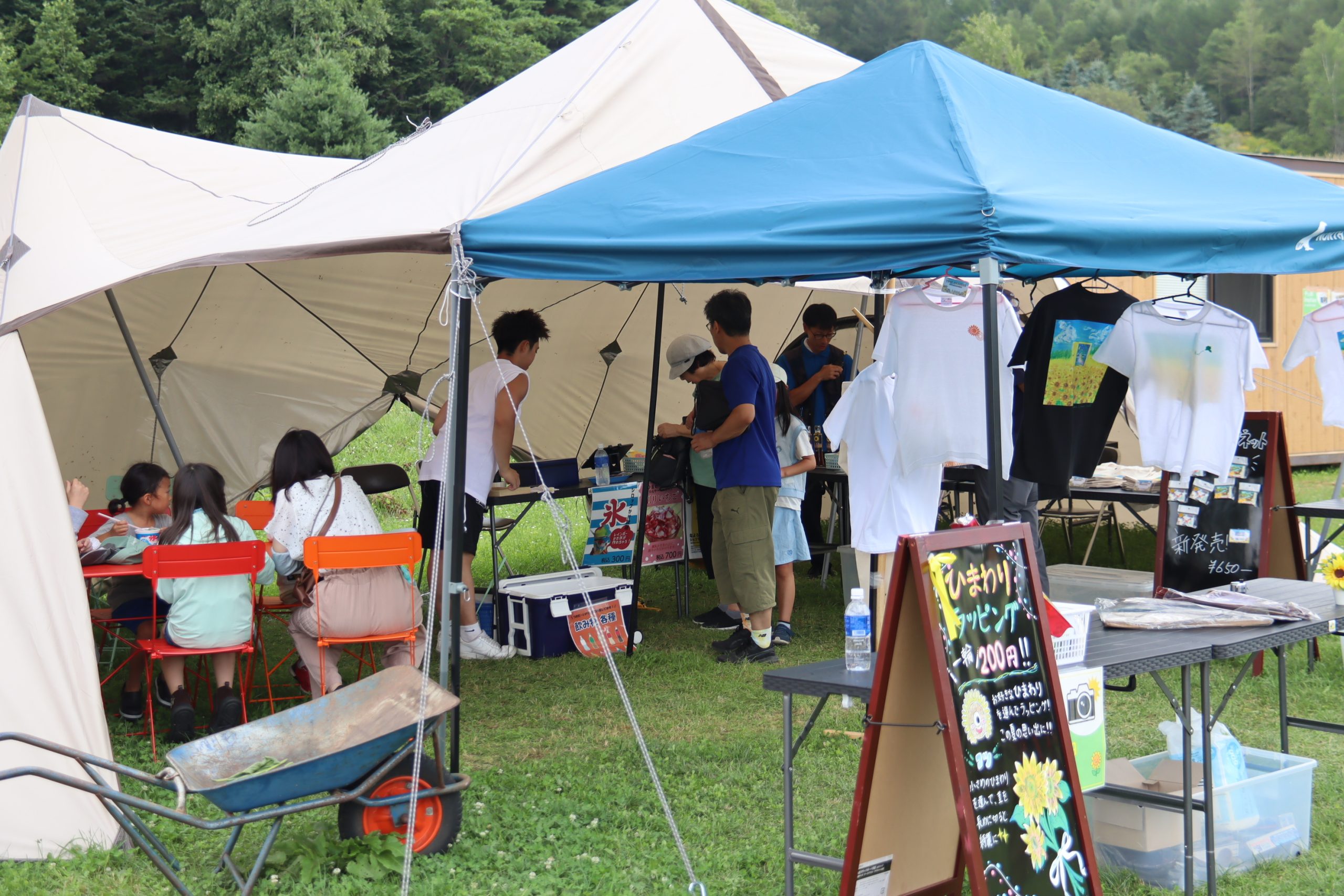 売店では、同協会職員がデザインしたひまわり畑の絵がプリントされたオリジナルTシャツやトートバッグ、ご当地マグネット、名寄のひまわり畑をイメージして作った「なよろひまわりショコラクッキー」などを販売。また、かき氷や冷凍イチゴをスライスして練乳をかけた「削りいちご」なども用意され、人気を集めている。