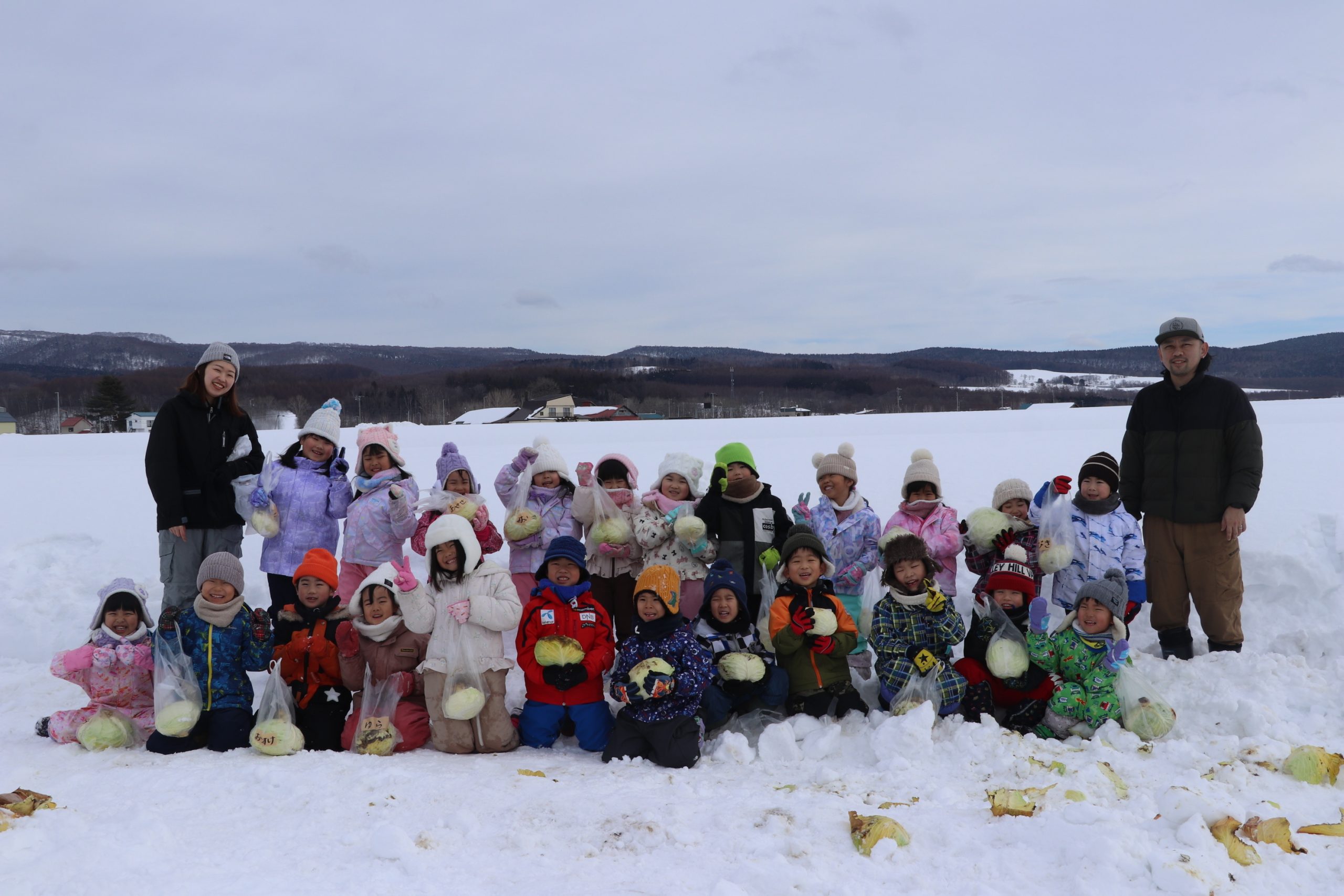 名寄大谷認定こども園(佐々木麻有美園長、園児98人)の年長児24人は18日、中名寄の平間京太さん宅で、越冬キャベツの掘り出しを体験した。