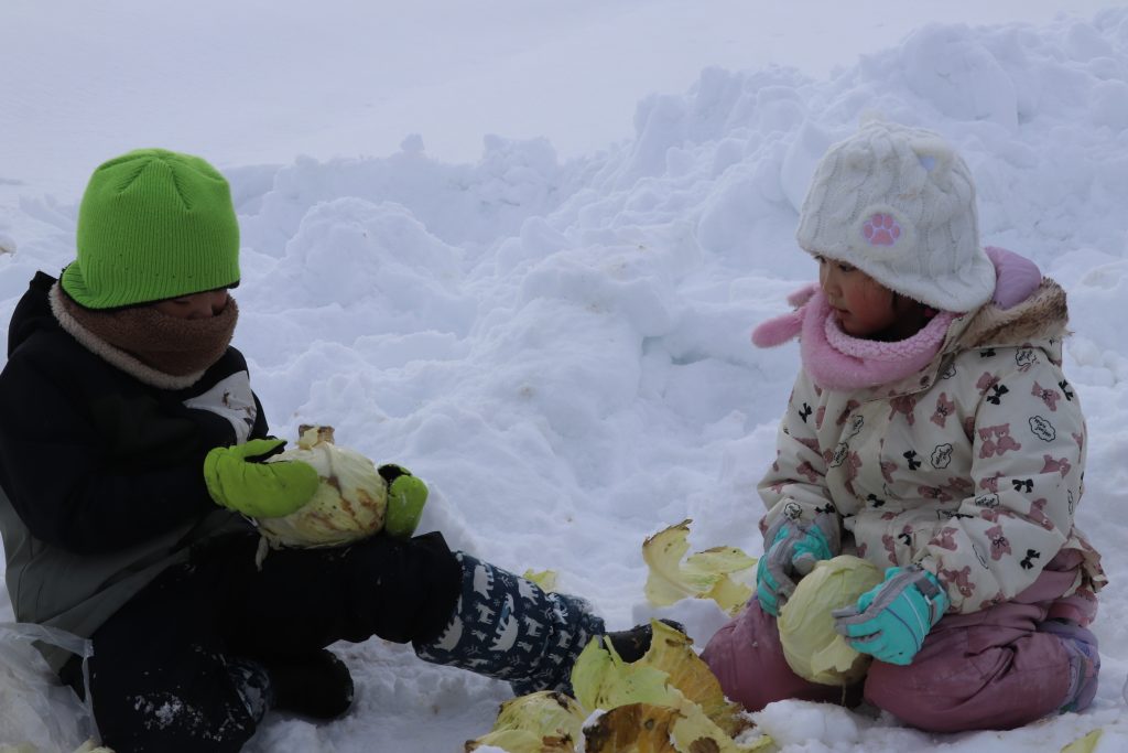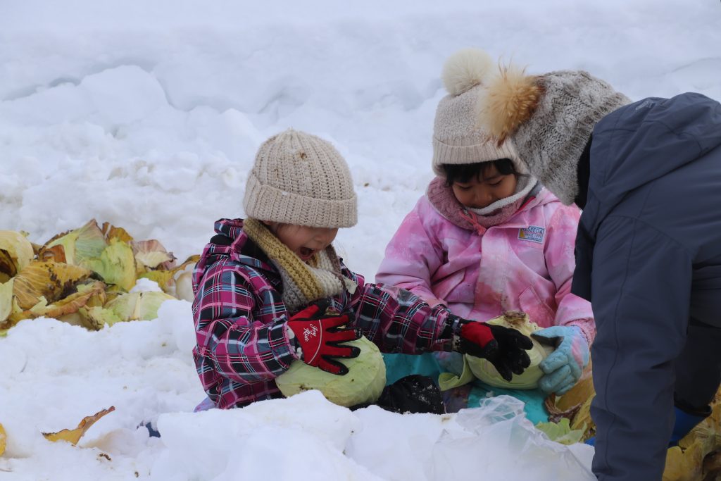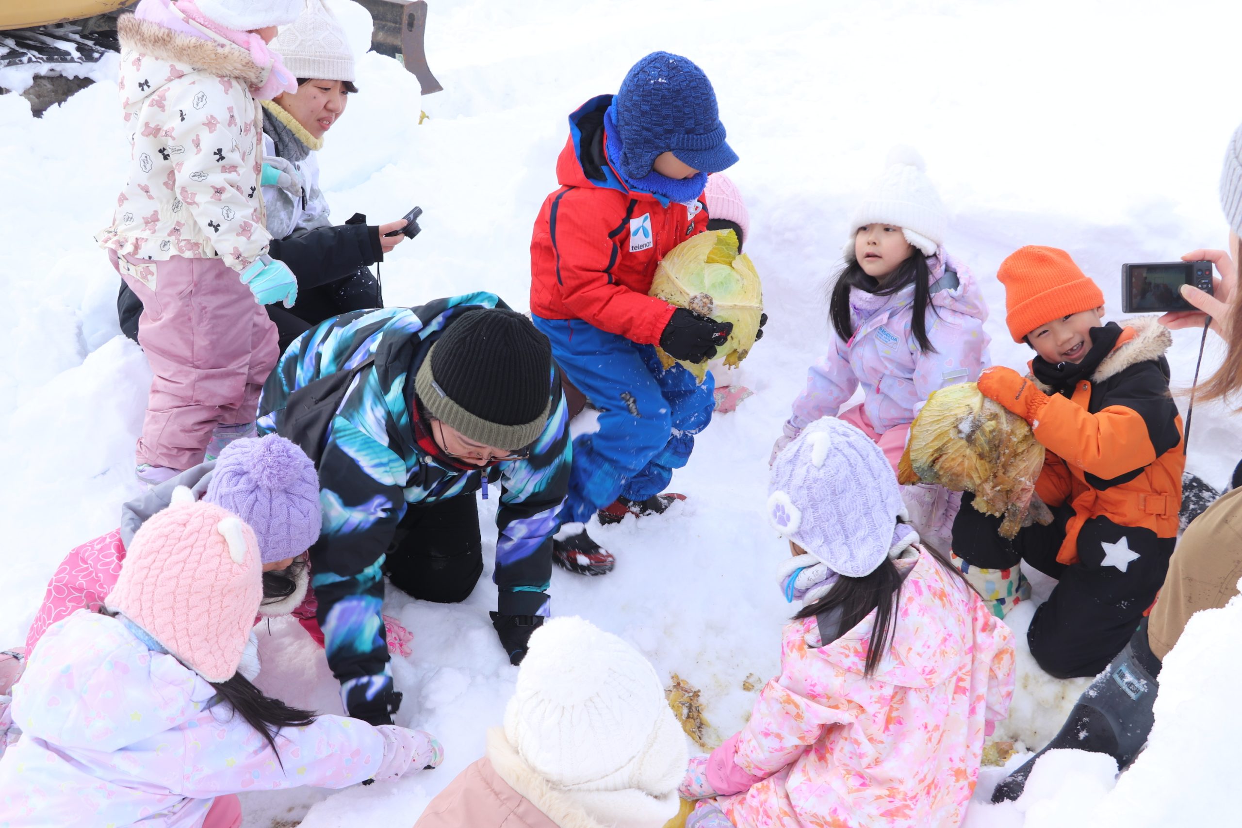 園児たちは、雪に覆われた圃場に到着後、平間さんがショベルとスコップを使って、越冬キャベツを掘り起こす様子を見学。4、5人に分かれ、平間さん夫妻や先生のアドバイスを受けながら、雪の中のキャベツを一生懸命に掘り出した。