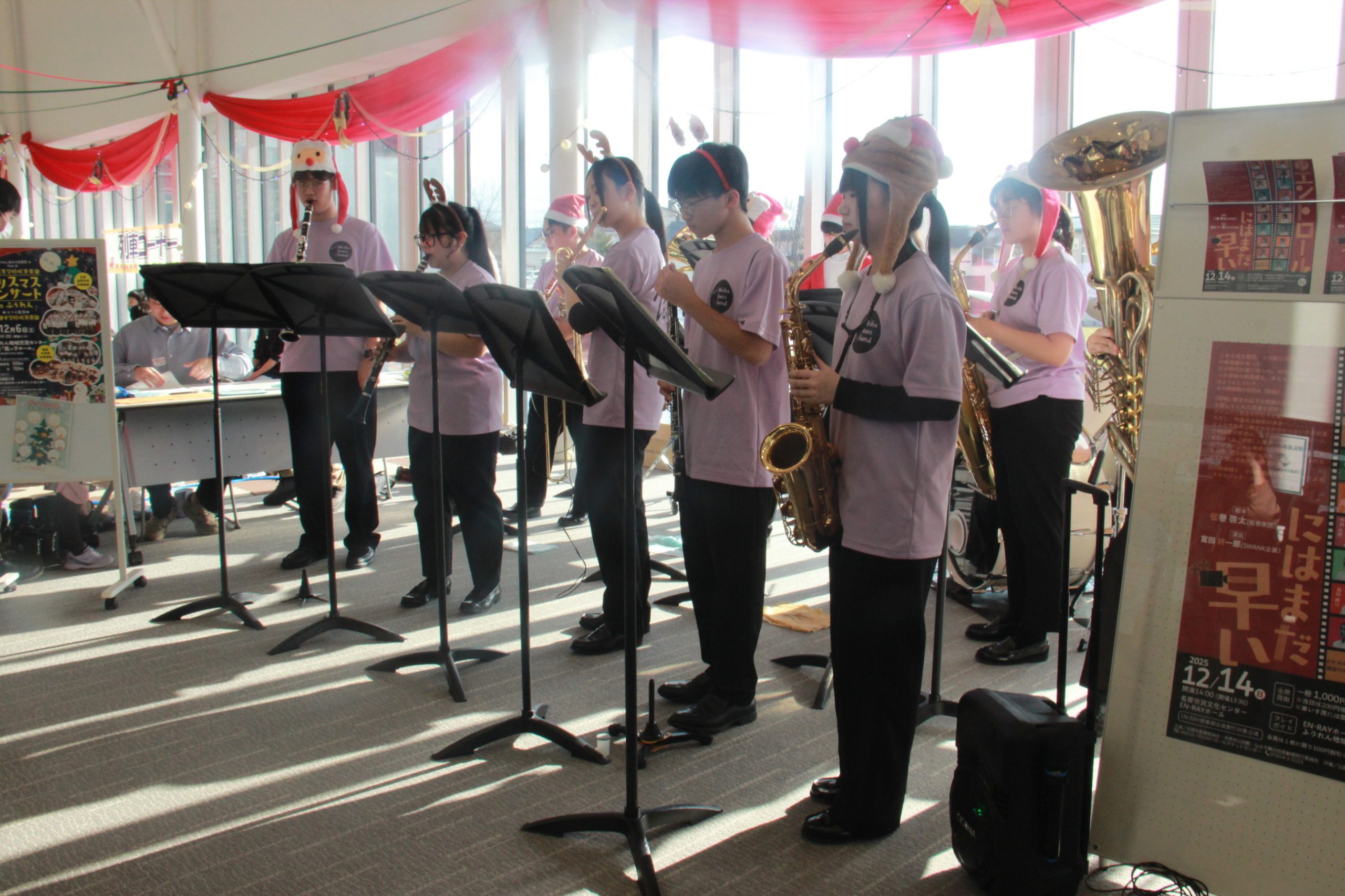 名寄高校吹奏楽部が協力し、午前中はクリスマスにちなんだ楽曲を披露。午後から「楽器体験コーナー」を担当した。