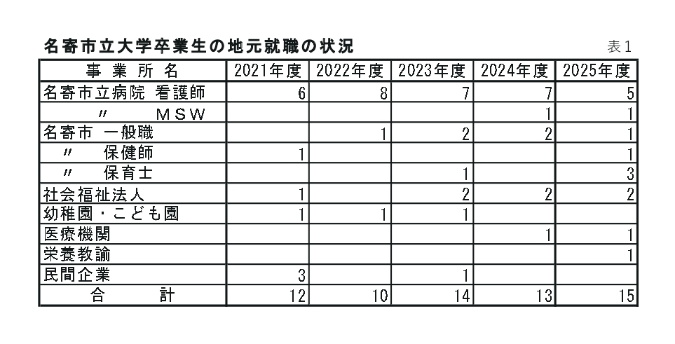 25年度の卒業生の地元就職の内訳をみると、名寄市立総合病院が看護師5人、MSW(医療ソーシャルワーカー)1人の計6人。名寄市が一般職1人、保健師1人、保育士3人の計5人。社会福祉法人2人、医療機関1人、栄養教諭1人を合わせて合計15人が地元に就職。近年では、最も多くの学生が名寄市を選んだ。
