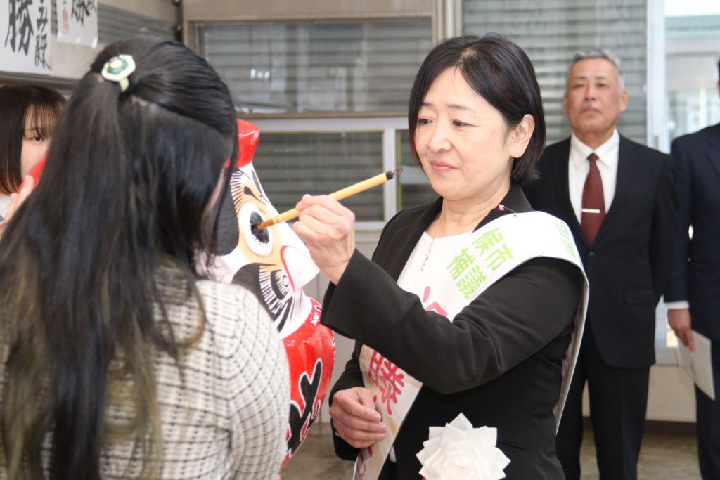 当選が確定し、だるまの目入れを行った