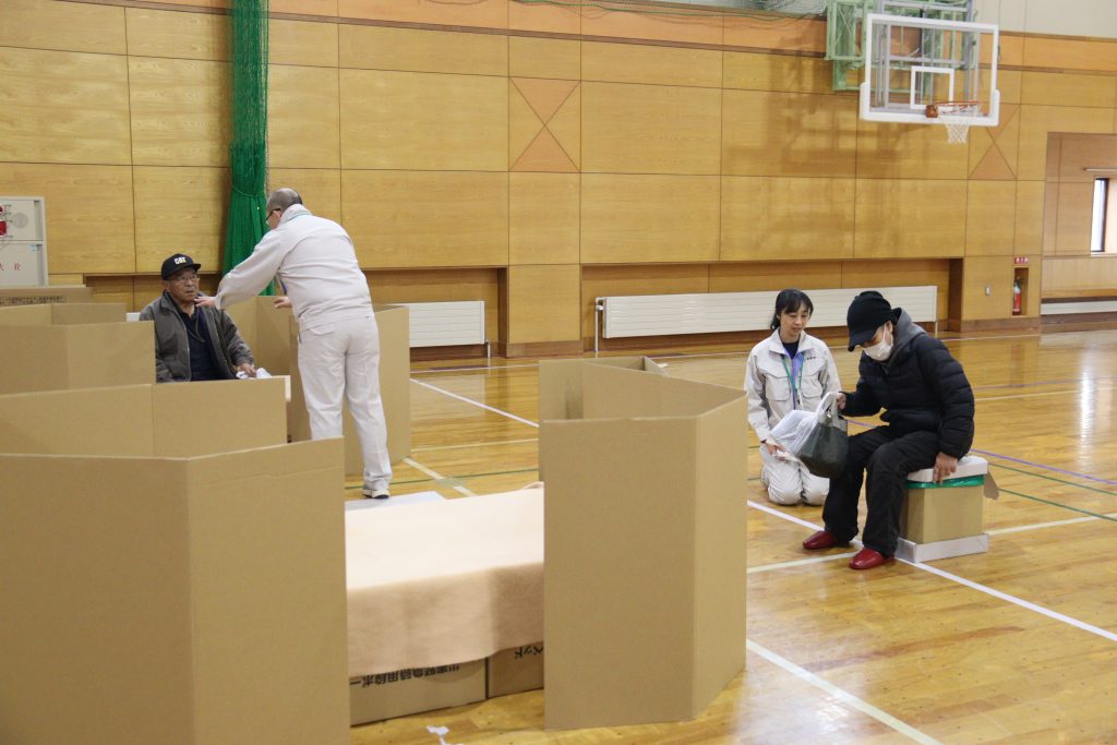 避難所を訪れた住民たちは、災害緊急時用の段ボール製ベッドや簡易トイレの利用方法について、担当職員から説明を受けた。段ボールベッドの上に座ったり、寝転んだりしながら感触を確認する様子が見られるなど、避難所生活の一端を体感。防災意識を新たにしていた。