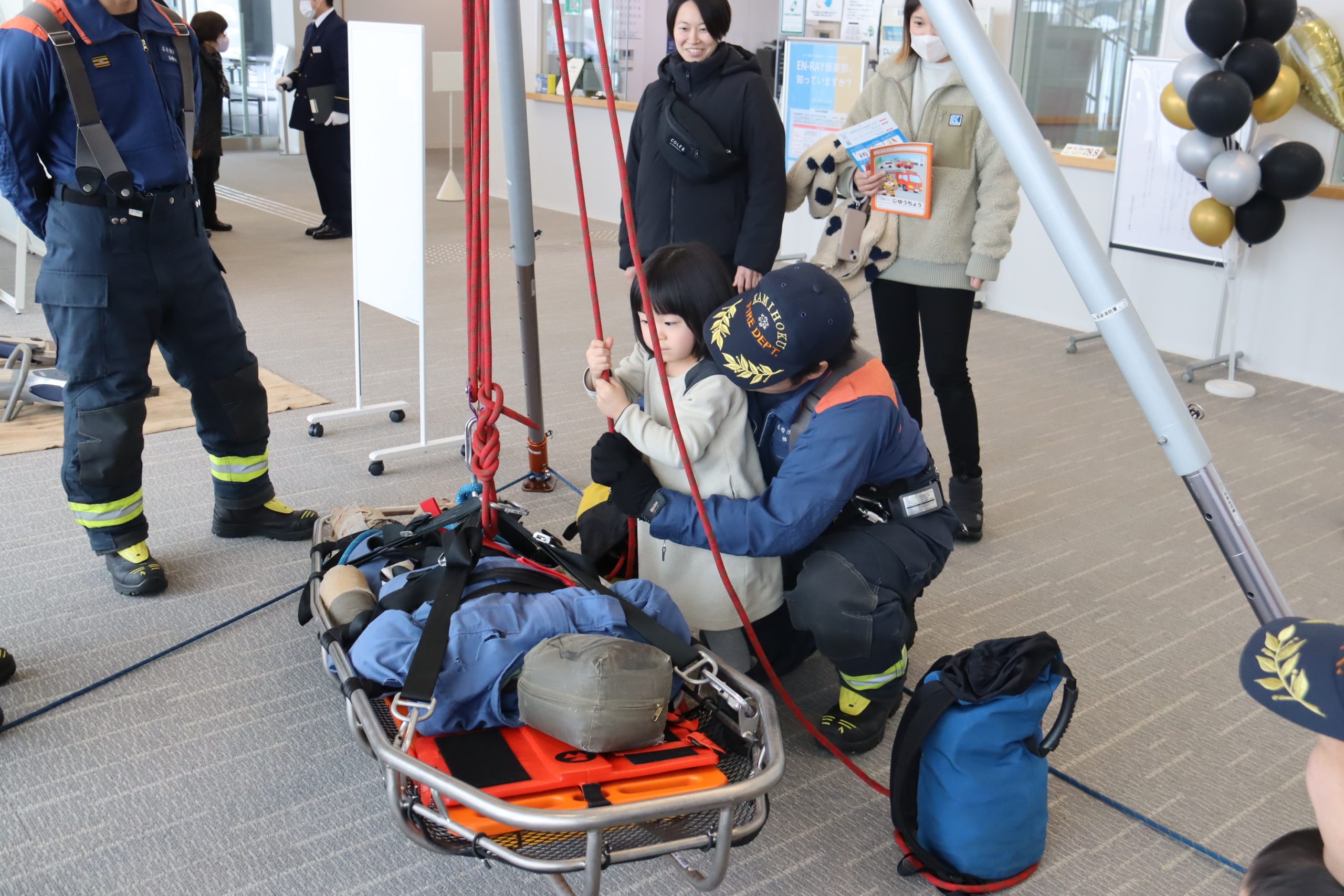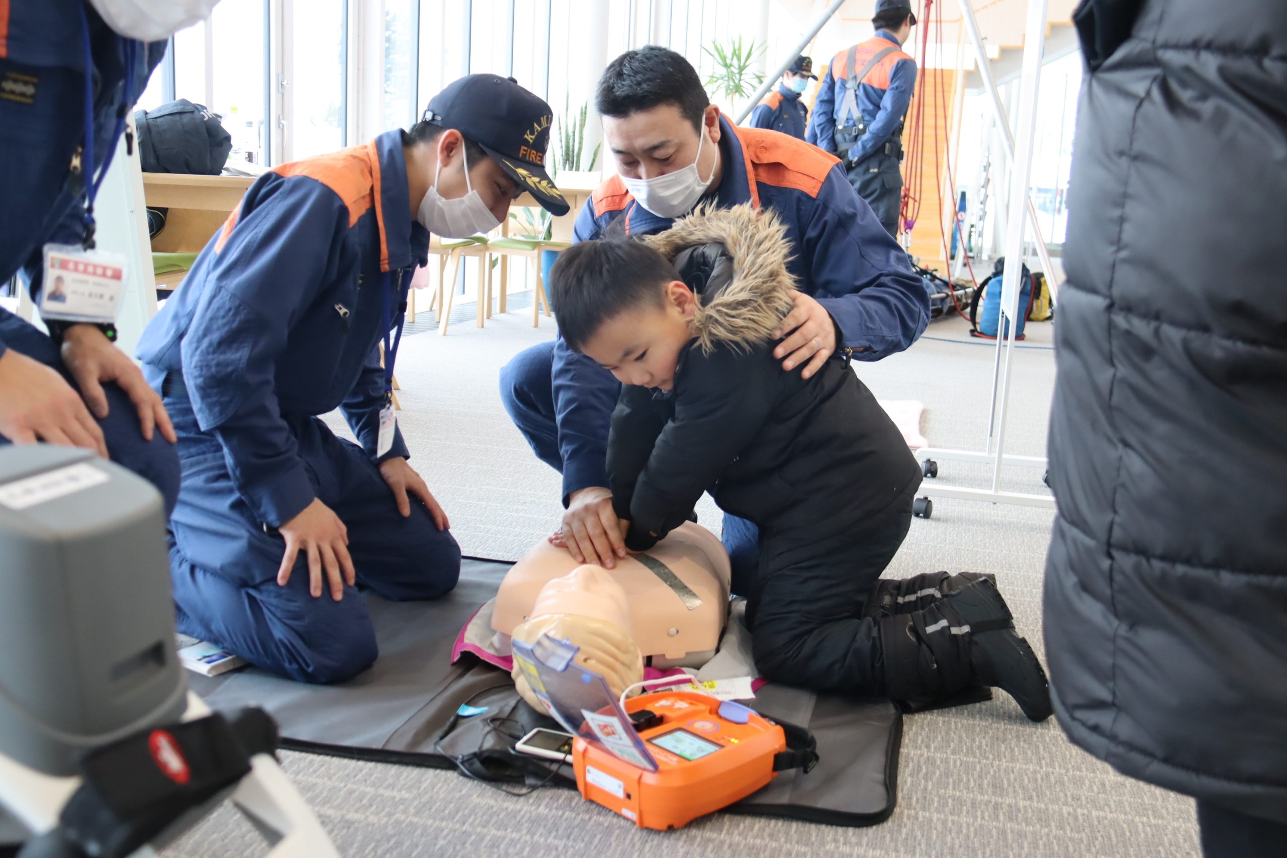また、午後1時からは消防の広報啓発コーナーも開設。屋外では消防車、救急車などの車両展示。屋内では救助資機材の展示や消火体験、AED体験などが行われ、多くの親子が体験し、消防活動の一端に理解を深めた。