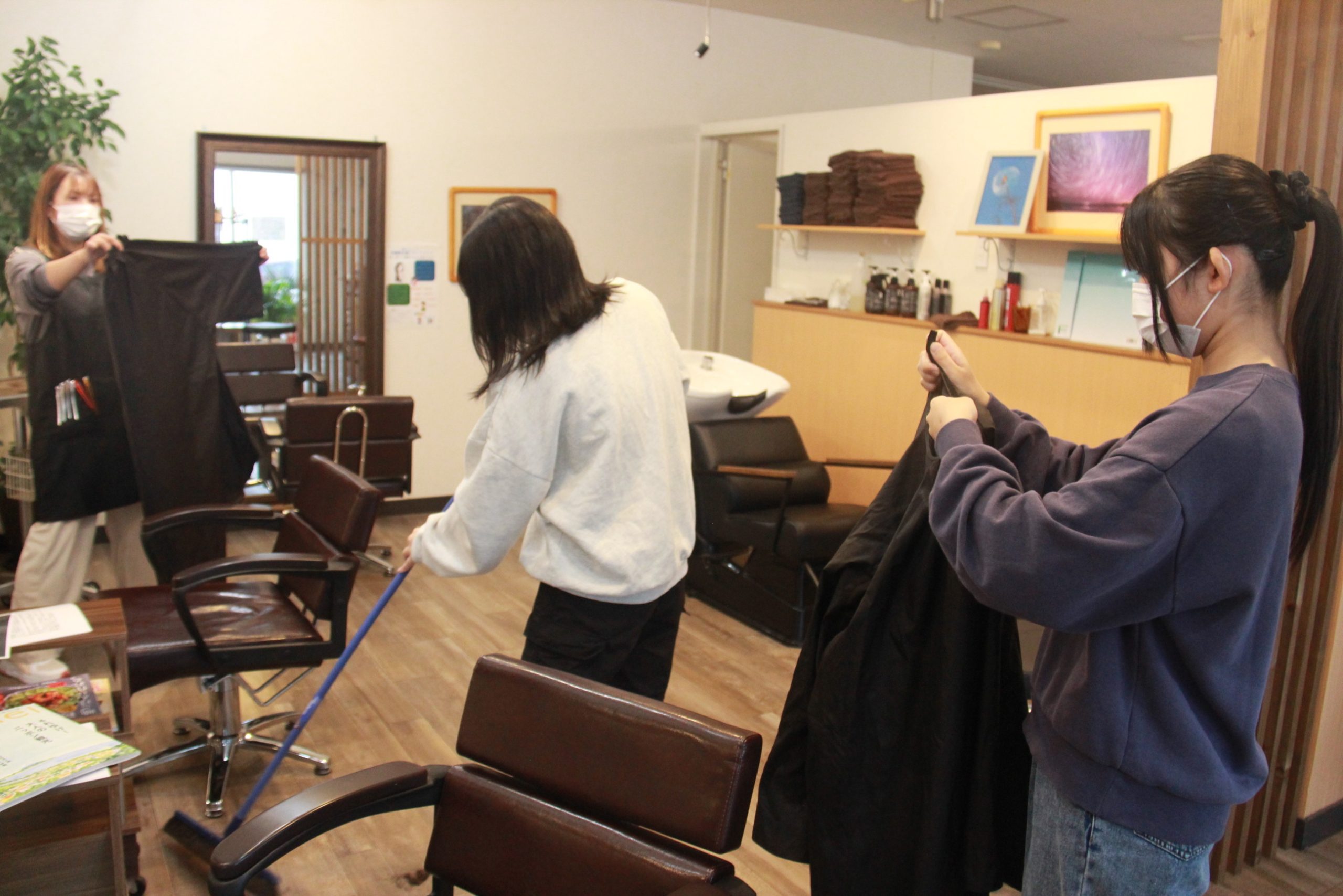 ドミールヘアーでは、1年生2人を受け入れ。来店客の案内をはじめ、客に雑誌を提供したり、髪の毛を乾かしたり、クロスの整理、掃除などを体験していた。