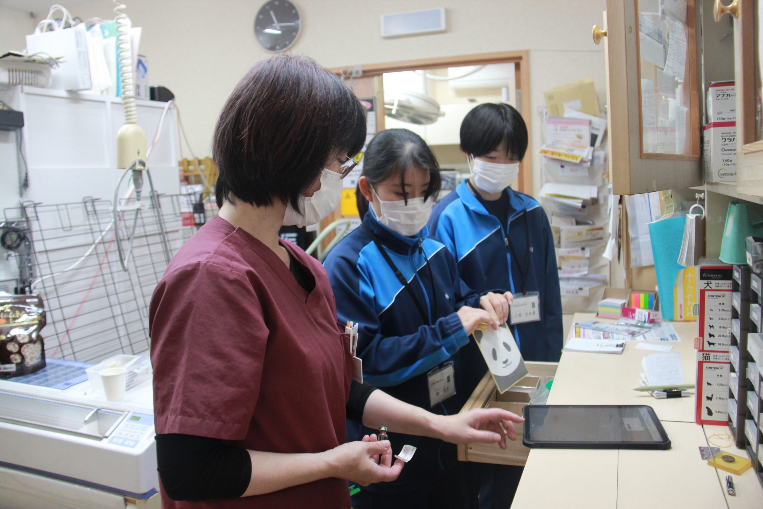 さんぺい動物病院では、2年生3人を受け入れ。生徒たちに診察している様子を見てもらったり、獣医師と飼い主との会話を聞いてもらうとともに、薬を入れる袋に記入するなど、調剤の仕事の一端も体験した。