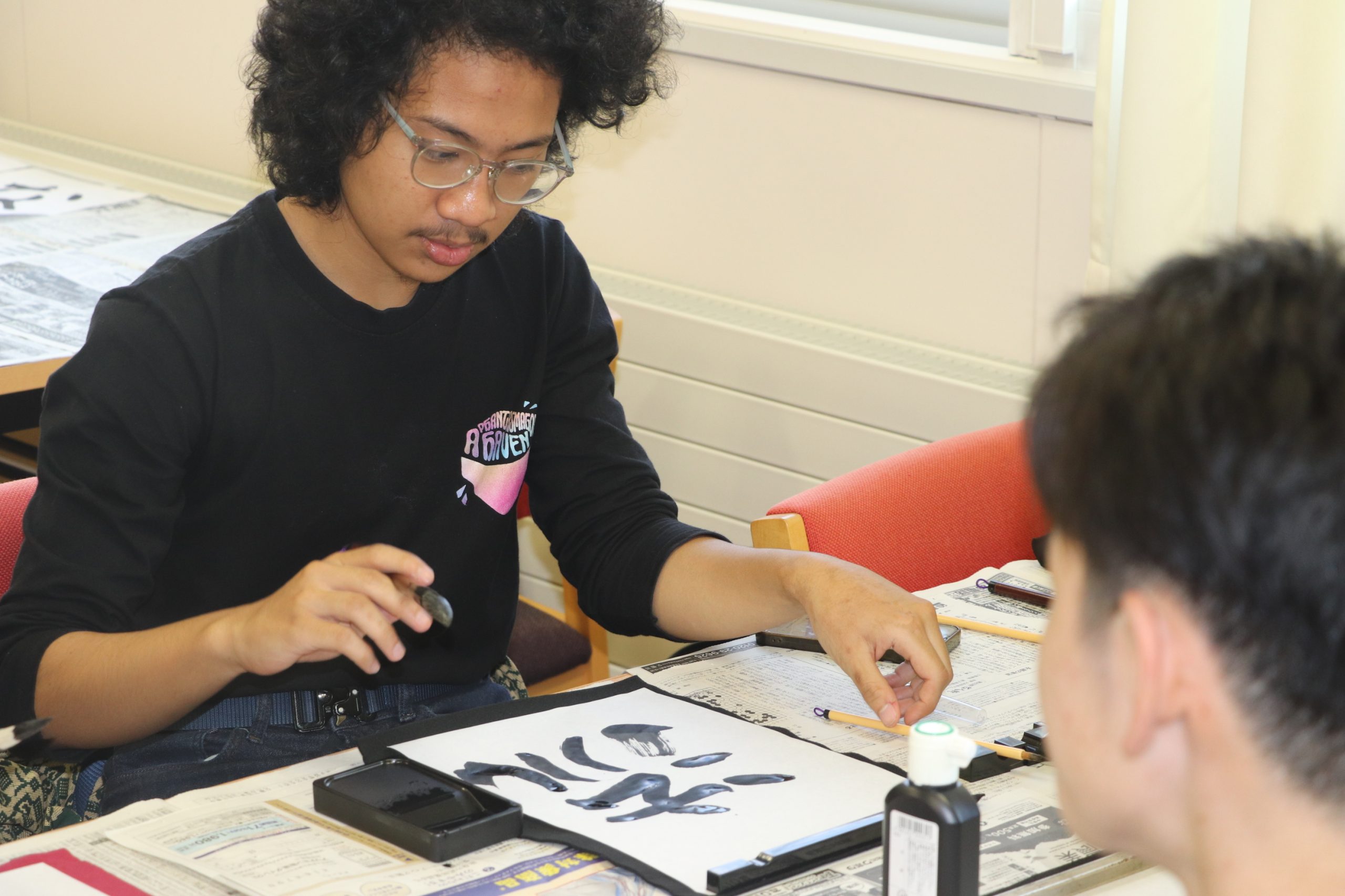 放課後は、6人のサポート役を中心に日本の伝統文化である書道を体験。墨汁、筆、硯(すずり)などを生徒が説明し、「なよろ」の文字を書いた。
