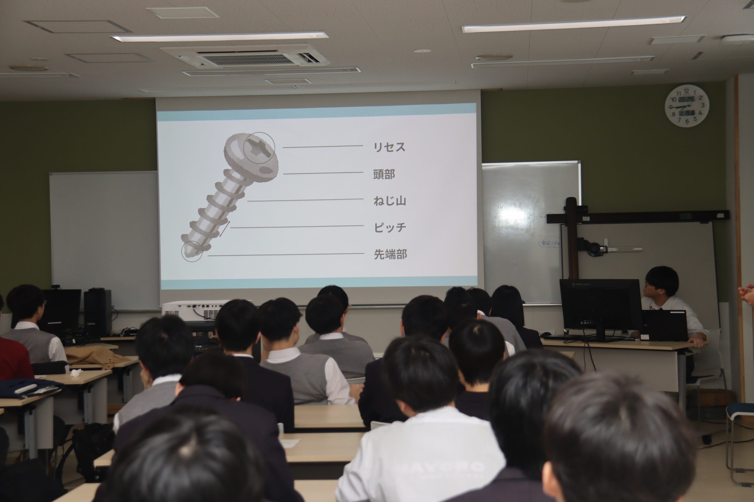 このうち、「ねじの規格と物理から見た機械的性質」の発表では、リセス、頭部、ねじ山、ピッチなどねじの構成要素について説明。ねじの規格について、形状、寸法、角度、ピッチを定めた基準とし、「ねじの強度、安全性、使いやすさ―の3点のバランスをとることが重要で、社会で共通したのが規格」と説明。また、ねじ山角が60度となっている理由として、「力の伝達効率、摩擦・応力集中の抑制、加工・量産のしやすさ―が考慮され、国際規格で採用。規格は最適化の結果である」などとした。