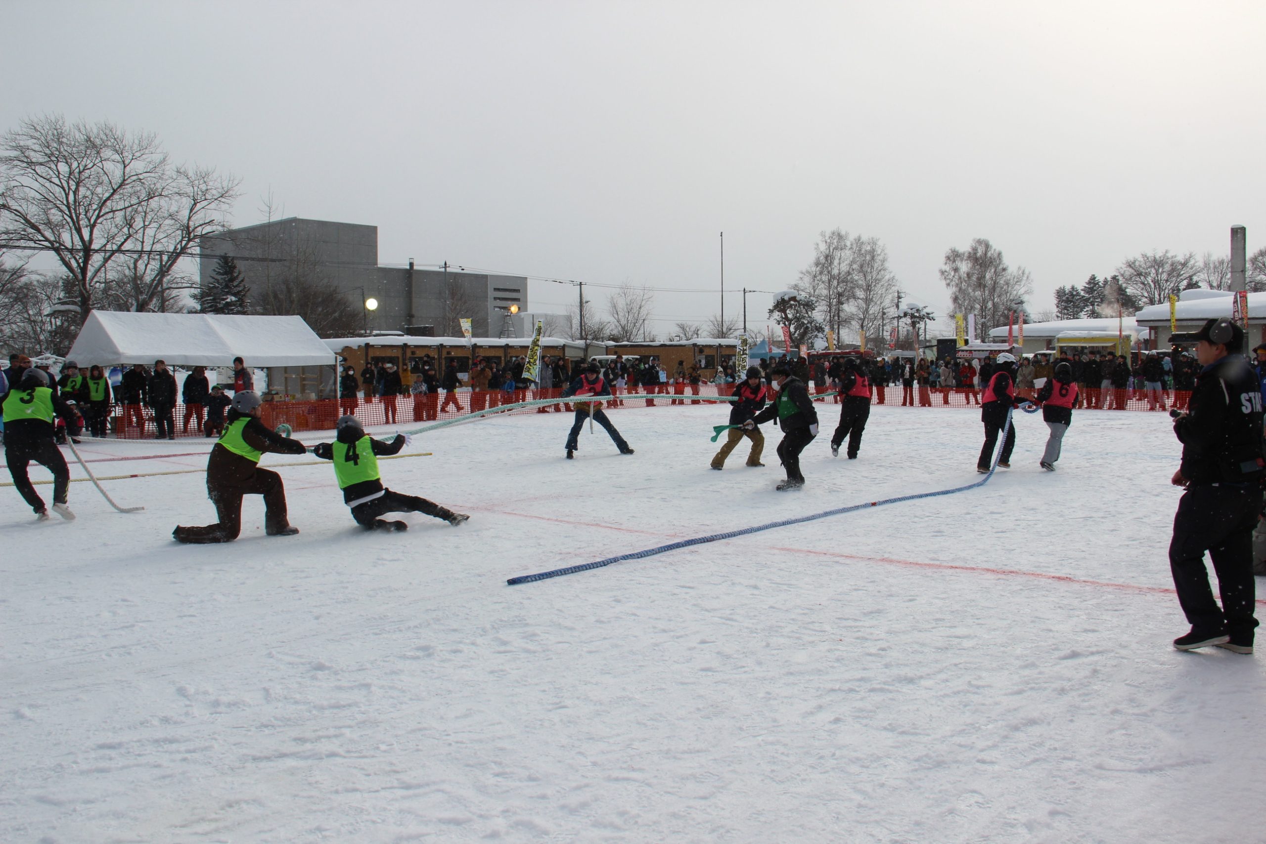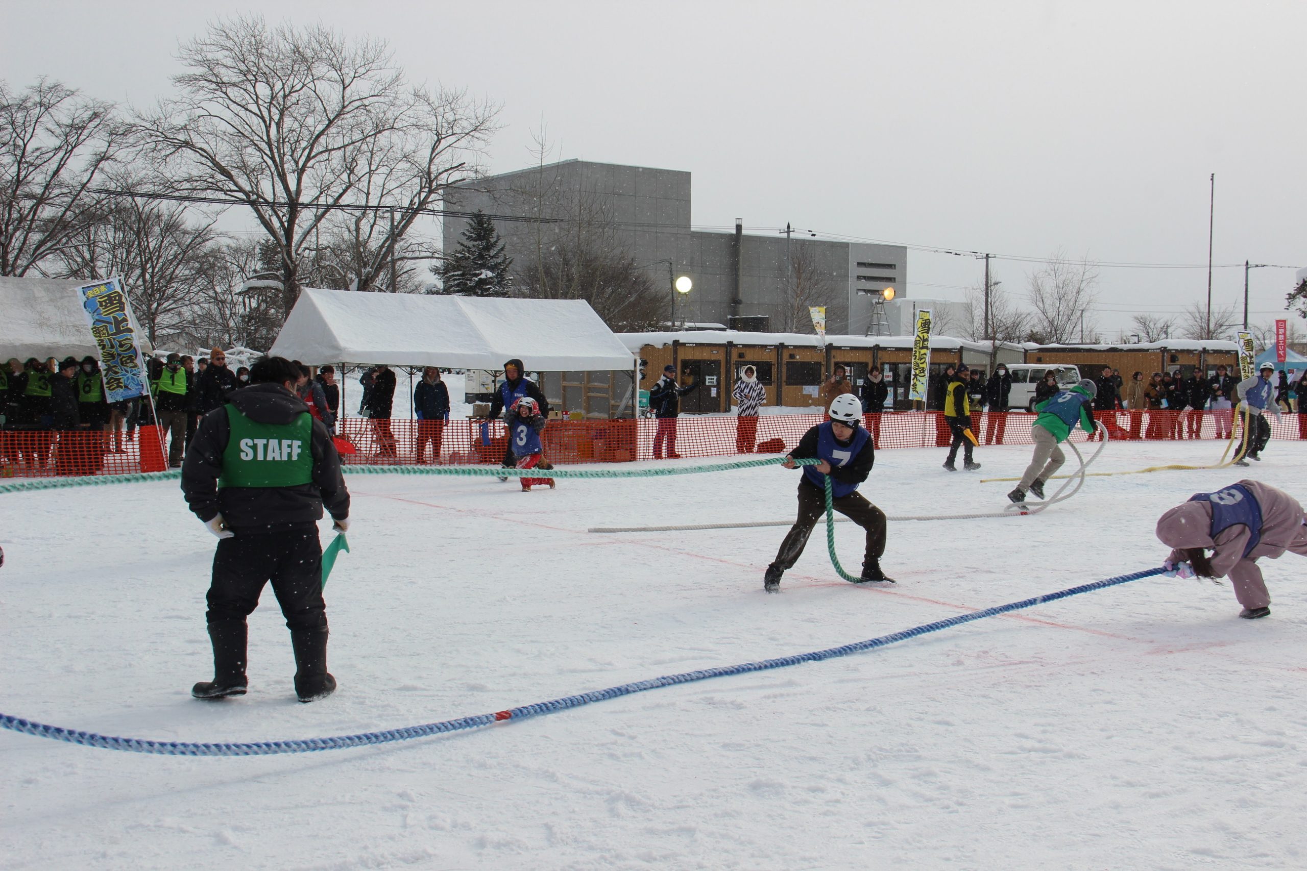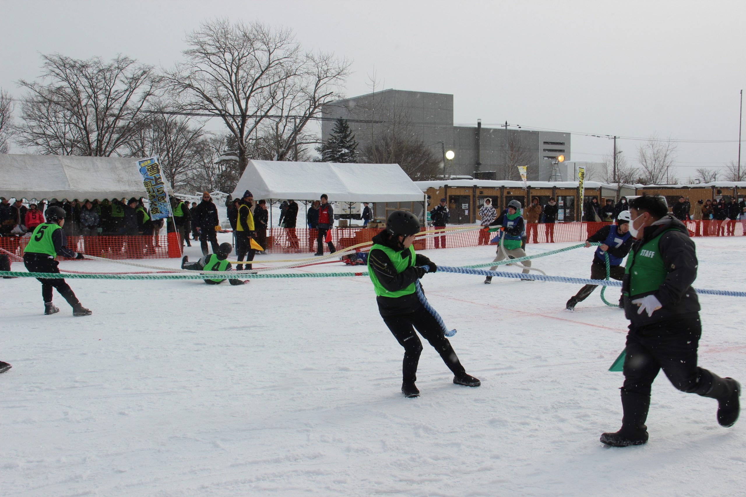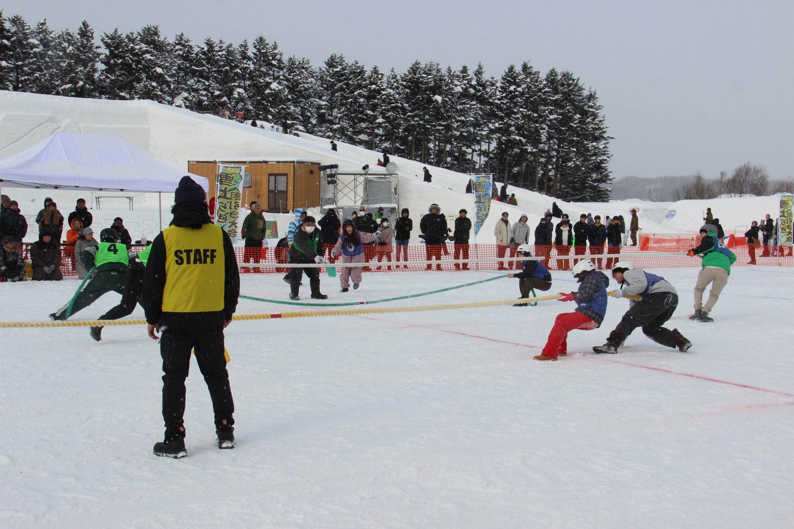 全日本雪上5色綱引き実行委員会(大会長・泉谷理事長)が中心となり、雪フェスイベントの一環として開催。今大会には市内をはじめ、旭川、遠くは東京都などから事業所や各種団体、友人同士で編成した32チームが参加した。
