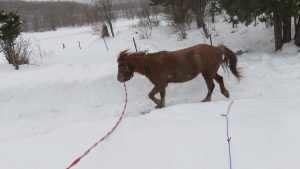 馬を飼っている人に子馬の無口頭絡(むくち・とうらく)を付けてもらい、「子馬の首にロープの輪をかけると、子馬は暴れて首が絞まる。動けなくなったところで無口を付ける。短時間で健康に影響はないとのこと。付けた無口に、リードロープを付けて木につないだ。子馬は自由に動けないまま、何時間かそのままにしておくよう教えてもらった。この世では何もかも自由にできるわけではないことを覚えてもらうそうだ」と話す。