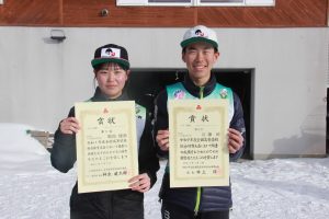 表彰伝達は各校で行われ、上川教育局教育支援課社会教育指導班の十河俊輔社会教育主事から安田さん、十河社会教育主事の代理で高舘正司下川小学校長から三浦さんに、それぞれ入賞作品が記された盾が贈られた。