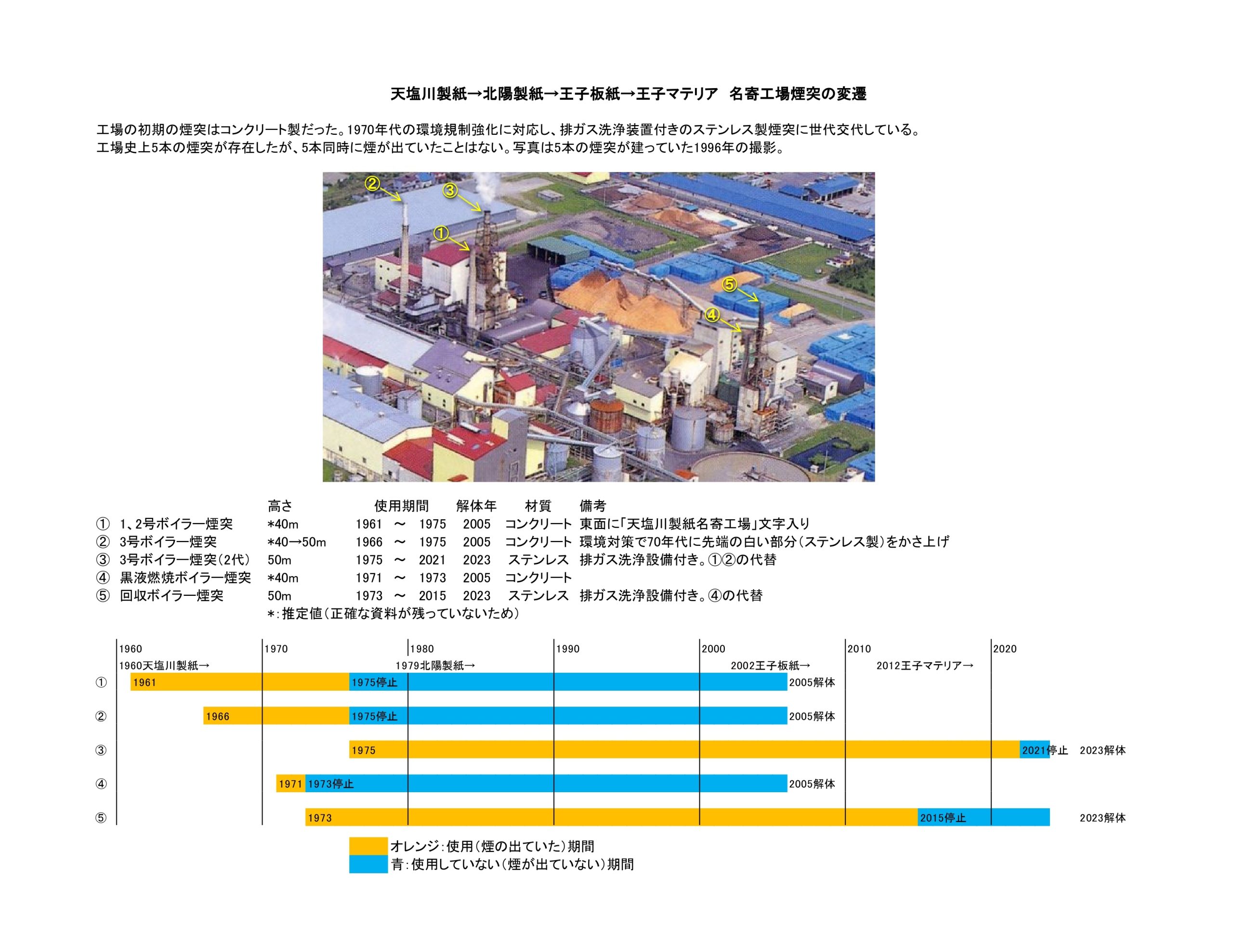 建造と供用、利用停止と解体時期の都合上、工場の煙突は1本だった時期から5本あった時期に区分され、写真やスケッチに描かれた煙突の本数や煙が出ているかどうかで、おおよその時期を推定できます。詳しくは、王子マテリア名寄事業所の柴田学氏から提供いただいた「工場煙突の変遷」表をご覧いただきたいと思います。