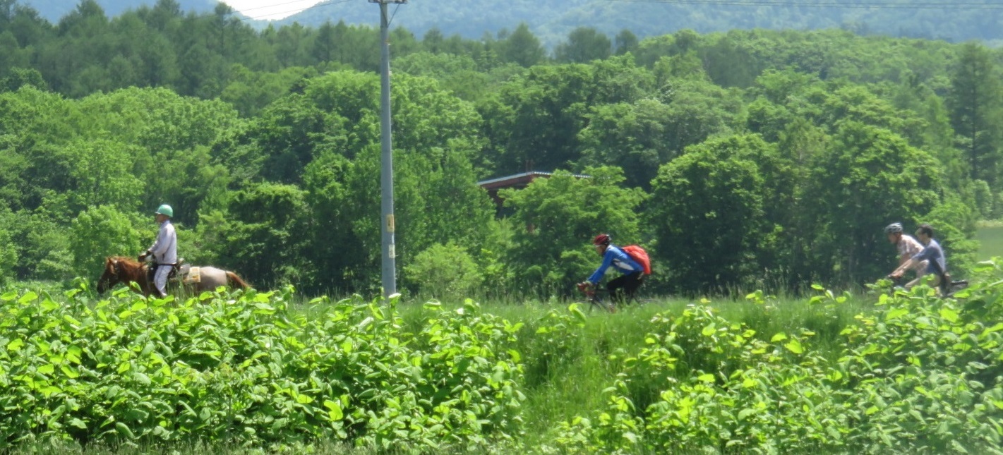 筆者(小峰)が下川町で飼っている愛馬「ハナ」(ドサンコ)との活動写真だが、これは2016年6月16日に3度目の「ドサンコポタリング」(自転車と一緒に乗馬で路上走行)を、地元ポタリングサークルと実施したときの様子である。三の橋・二の橋から市街地へ続く山道(ペンケ方面)コースで、愛馬は起伏に富んだ坂道を、ものともせず走った。「下り坂では手綱の紐を伸ばしたり縮めたり、愛馬の体が前のめりにならないよう、足場に応じ調整しながら走らせた」と当時の日記につづっており、今では当たり前にこなしている外乗だが、下り坂でバランスを崩さないように気を使ったものである。