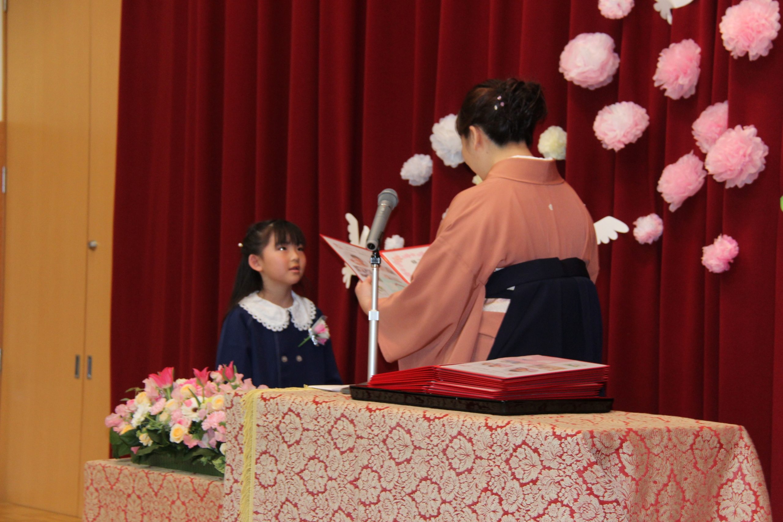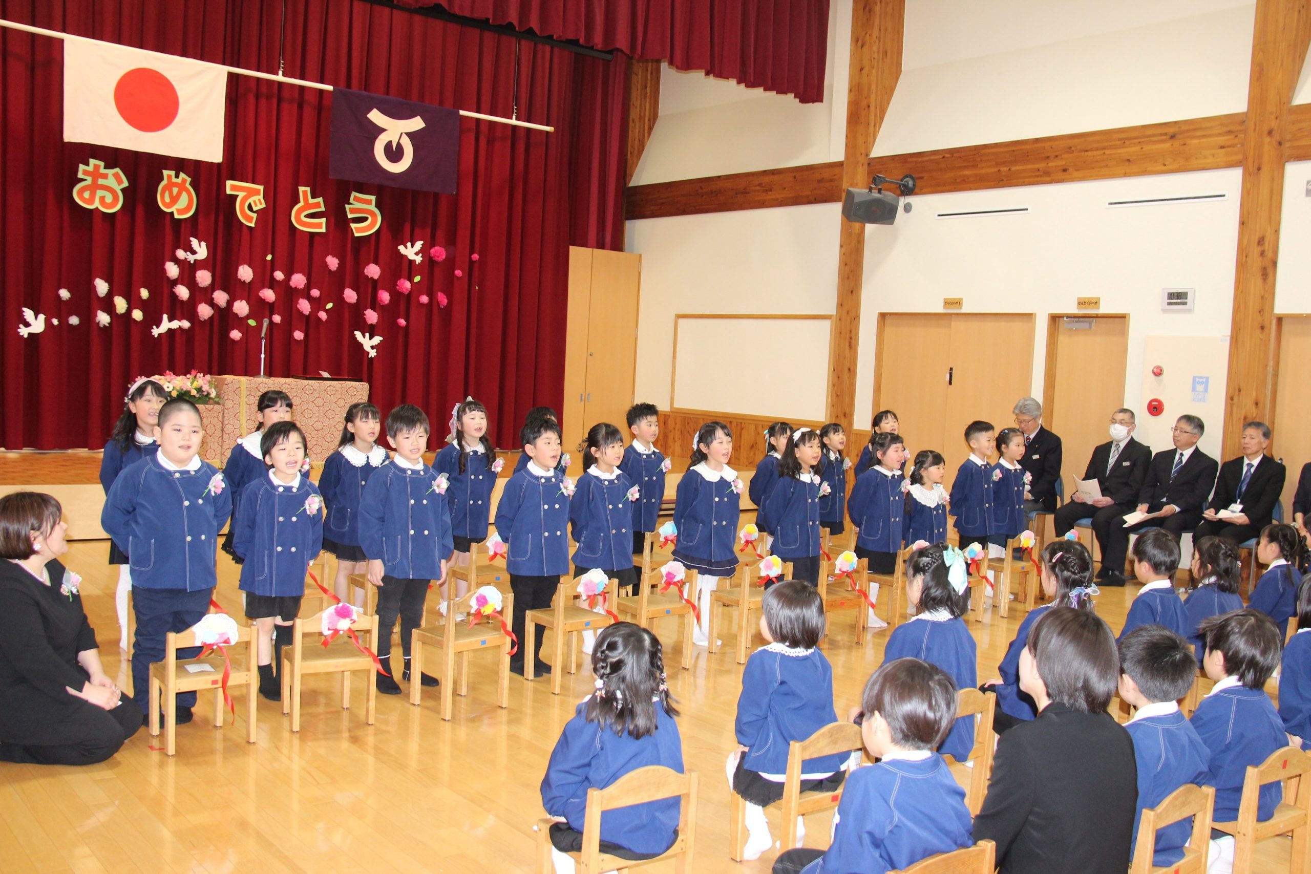 古屋園長は卒園児に「入園した頃、寂しくて泣いていた顔が目に浮かぶ。たくさんの体験を通し、友達と仲良く遊び、心も体も大きくなった。『ありがとう』『ごめんなさい』と言える、感謝の気持ちや素直な気持ち、夢や目標に向かって行動する元気と勇気を忘れず、自分と友達を大切にして、明るく元気に自分の道を歩んでほしい」と祝いの言葉を述べた。