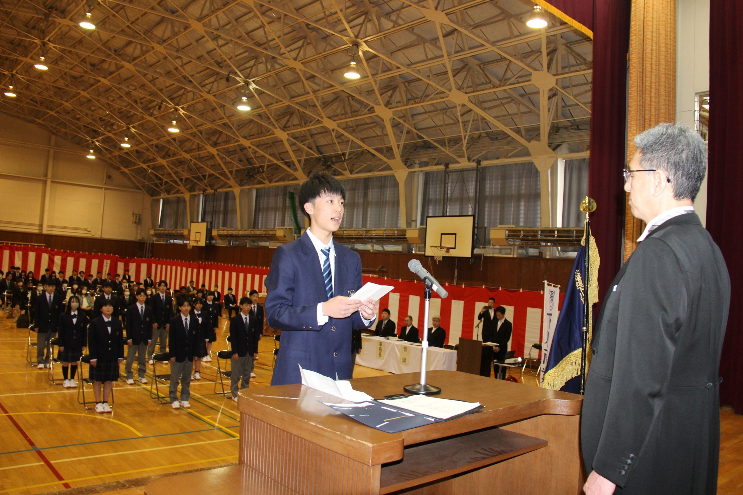 新入生代表の松田琉聖さんは、同校の地域と一体となった特色ある教育を通して「新たな視点、価値観、考え方を学んでいきたい」と述べ、「校訓の『自律』に習い、目標に向かって粘り強く努力し、充実した高校生活を送る」と宣誓した。