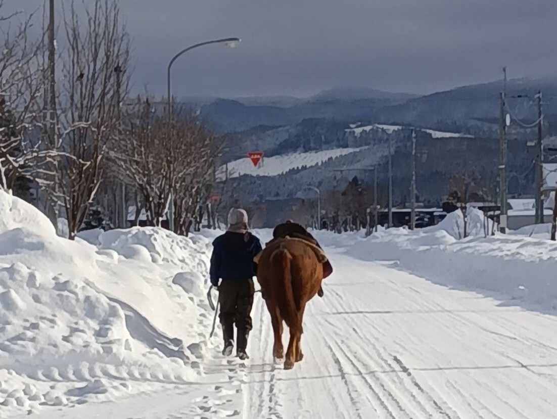 下川神社には、あらかじめ馬と行くことを連絡し、注意事項などを確認。当日も安全に移動して参拝できるよう、視界のよい天候や時間帯を選び、路面凍結による転倒を避けるため、乗馬での移動を控え、ハナを引きながら、ゆっくり歩いて向かうことにした。