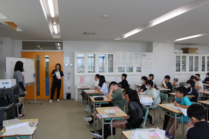 中名寄小の児童がバスで到着すると、各クラスに分かれて交流授業を開始。1年生は体育と国語、2年生は道徳と体育、3年生は図工、4年生は道徳と算数、5年生は道徳と外国語、6年生は外国語と総合の授業を通して交流し、給食も一緒に食べた。