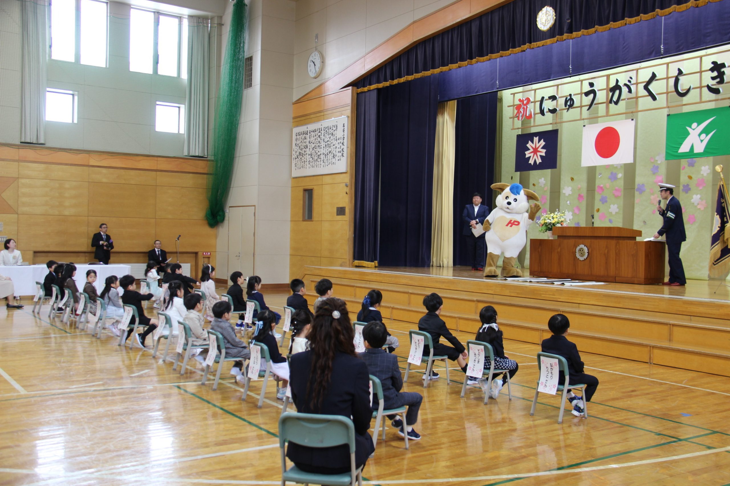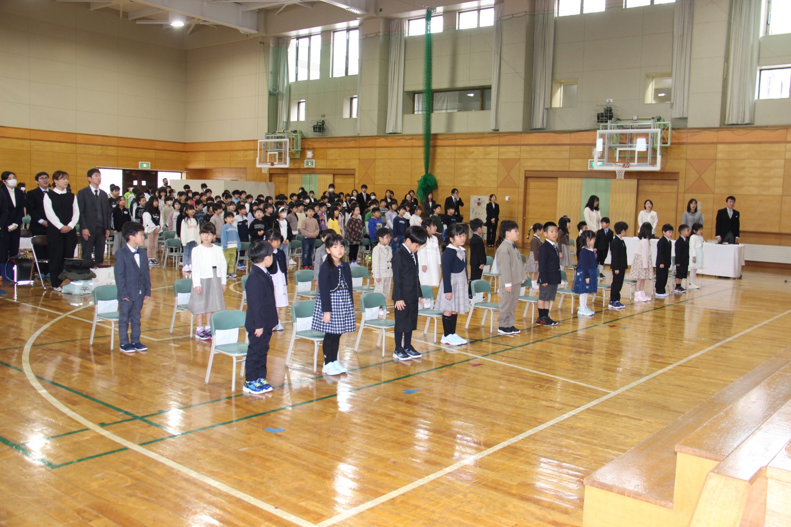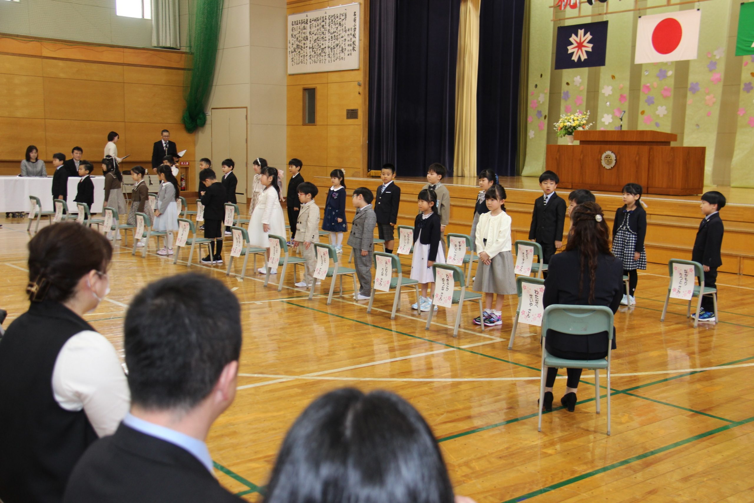 1年生は、保護者と一緒に会場の体育館に入場し、自分の名前が書かれた紙が貼られた椅子に着席。国歌、校歌斉唱に続き、新入生紹介で担任の先生に名前を呼ばれた児童たちは、初めての環境に少し緊張した様子を見せながらも「はい!」と元気よく返事をしていた。