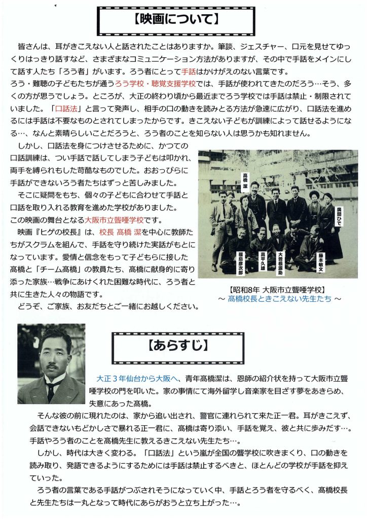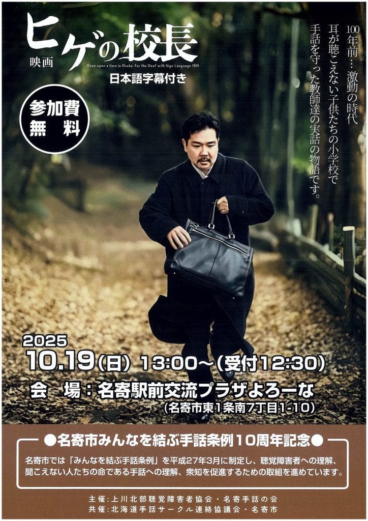映画ヒゲの校長 日本語字幕付き上映会 2025年10月16日 道北イベント情報 名寄市 文化・芸術 映画 100年前... 激動の時代 耳が聴こえない子供たちの小学校で手話を守った教師達の実話の物語です。 日時 10月19日(日) 13:00-・受付12:30- 会場 名寄駅前交流プラザよろーな(名寄市東1条南7丁目1-10) 料金 参加費無料
