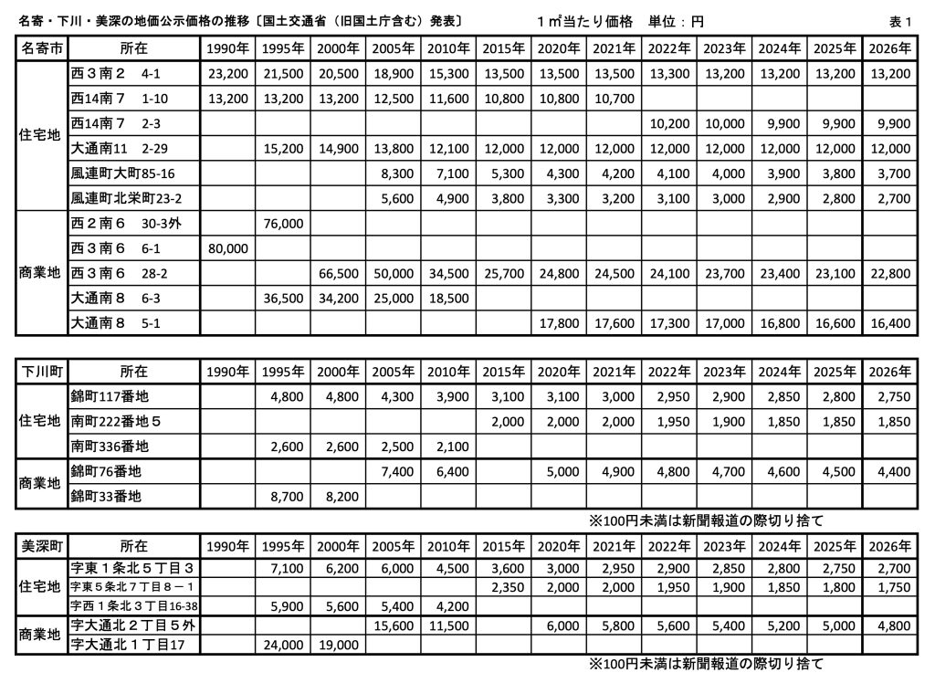 本紙管内では、名寄市が、1平方m当たり住宅地平均8300円(マイナス1・2%)、商業地平均1万9600円(マイナス1・3%)。下川町が、住宅地同2300円(マイナス0・9%)、商業地同4400円(マイナス2・2%)。美深町が、住宅地同2200円(マイナス2・3%)、商業地同4800円(マイナス4・0%)となっており、いずれも、減少に歯止めがかかっていない。