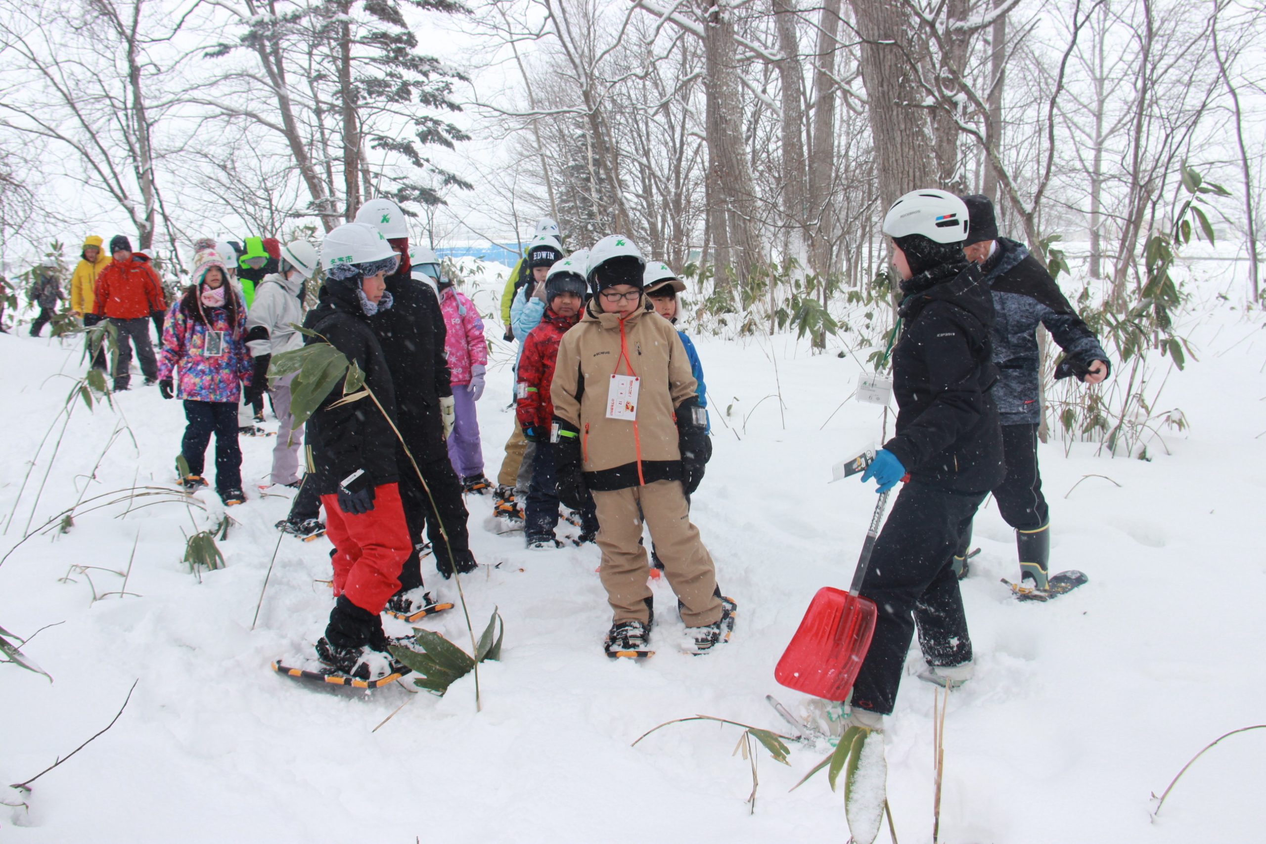 班ごとで自己紹介した後、屋外に出て、スノーシューを履いて同館周辺の森林を散策。宝探しも楽しむとともに、雪の降り積もった森を思い思いに駆け回っていた。
