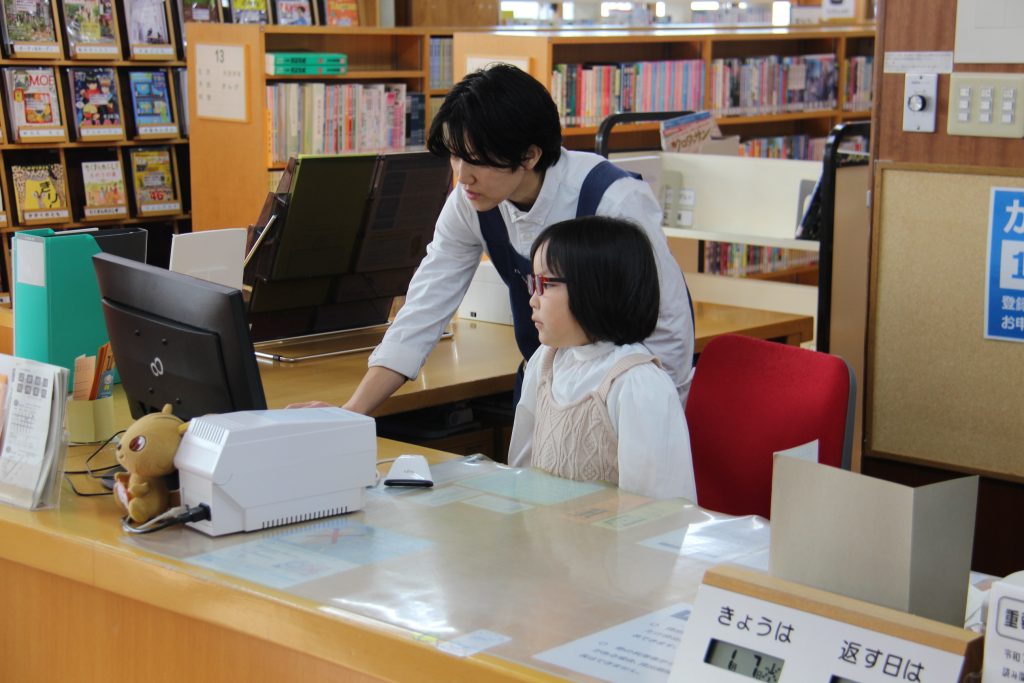 業務体験では、児童たちがカウンターでの貸し出しと返却対応、返却された本を所定の本棚に戻す配架作業、貸し出し状況などを把握するための本のラベル張り、パソコンの検索システムを使って図書を探す仕事などに挑戦した。