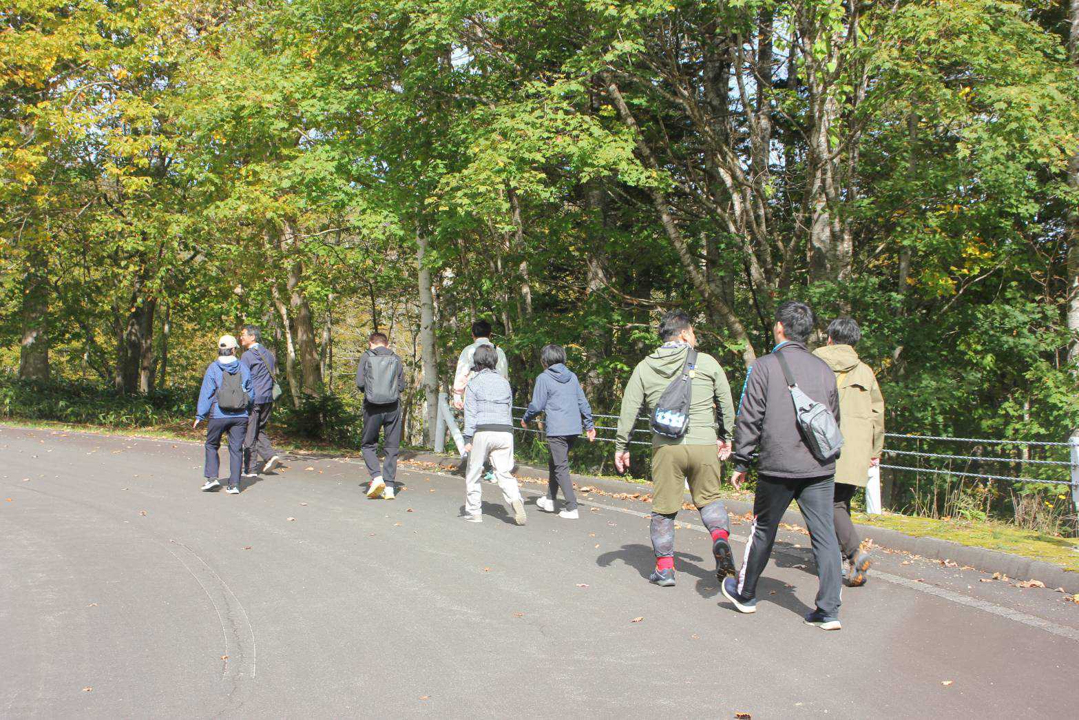 晴天が広がる中、葉が赤や黄に色付いた風景も眺めながら、それぞれのペースで歩みを進めていた。