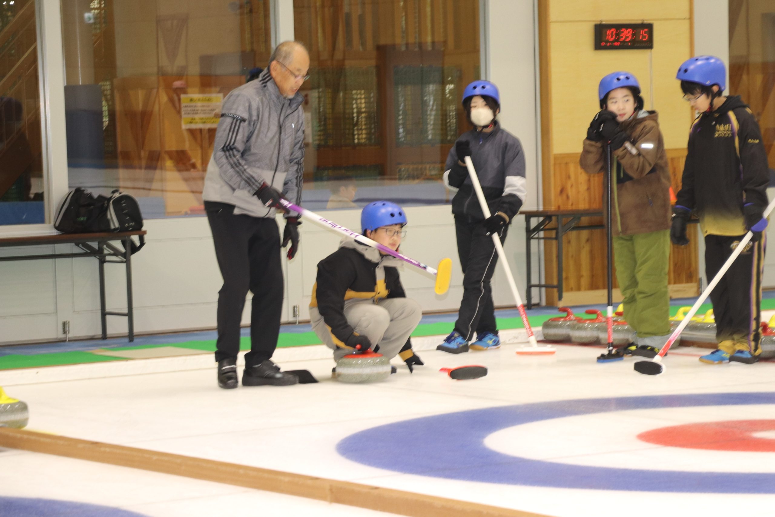 講師が「けがのないようにして、カーリングを楽しみましょう」と挨拶し、靴の履き方からストーンの扱いなどを説明。リンクでの歩き方、スケーティングの練習、ストーンの投げ方(フォーム)を指導した。