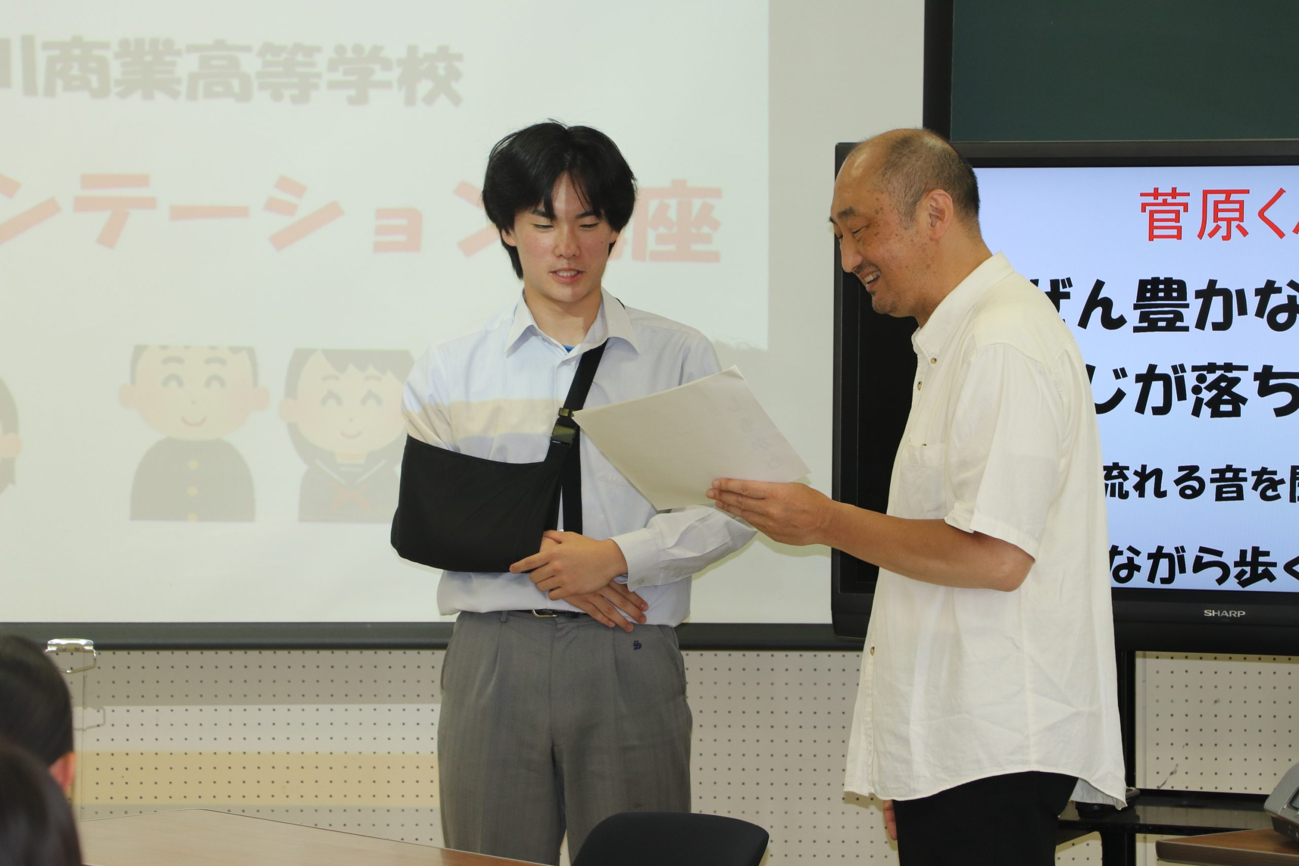 最後は「あいうえお作文」を実施。生徒からは「しもかわ」にちなんで、「しぜん豊かな、もみじが落ちるころ、かわの流れる音を聞きながら、わらいながら歩く帰り道」などが披露された。