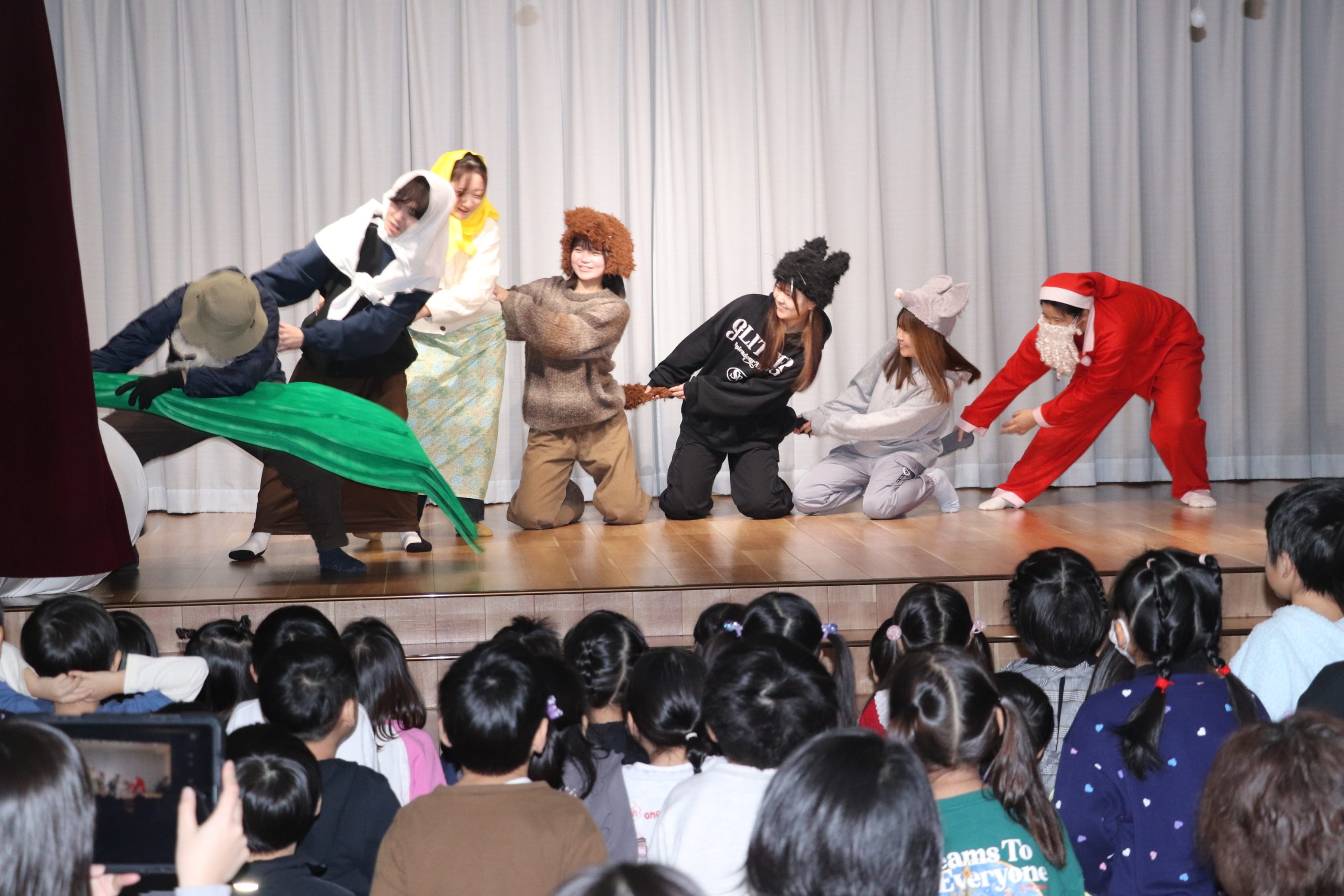 劇では、おじいさん、おばあさん、犬、猫、ねずみなどに扮(ふん)する学生が現れるたび、園児たちから「わー」「キャー」と歓声が上がった。