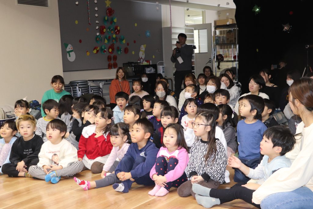 名寄市立大学社会保育学科(三井登学科長)のクリスマス会が、17日午前10時半から同大3号館児童文化演習室で開かれ、市立認定こども園「あいあい」の年中・年長児43人を招いた。