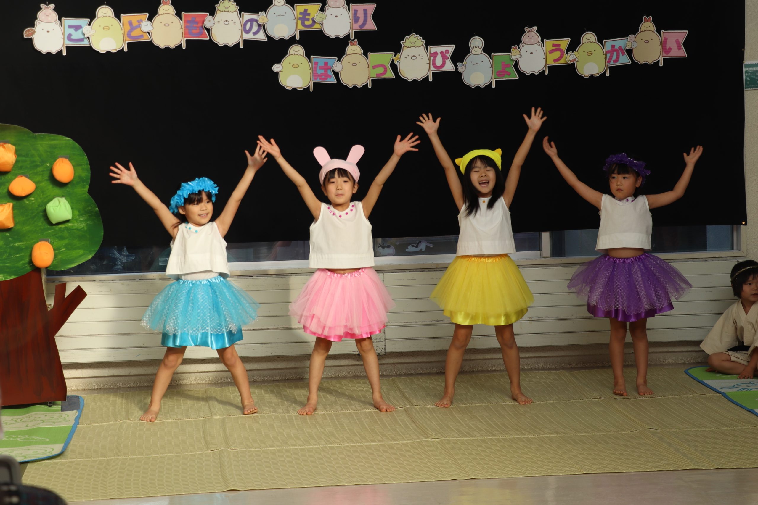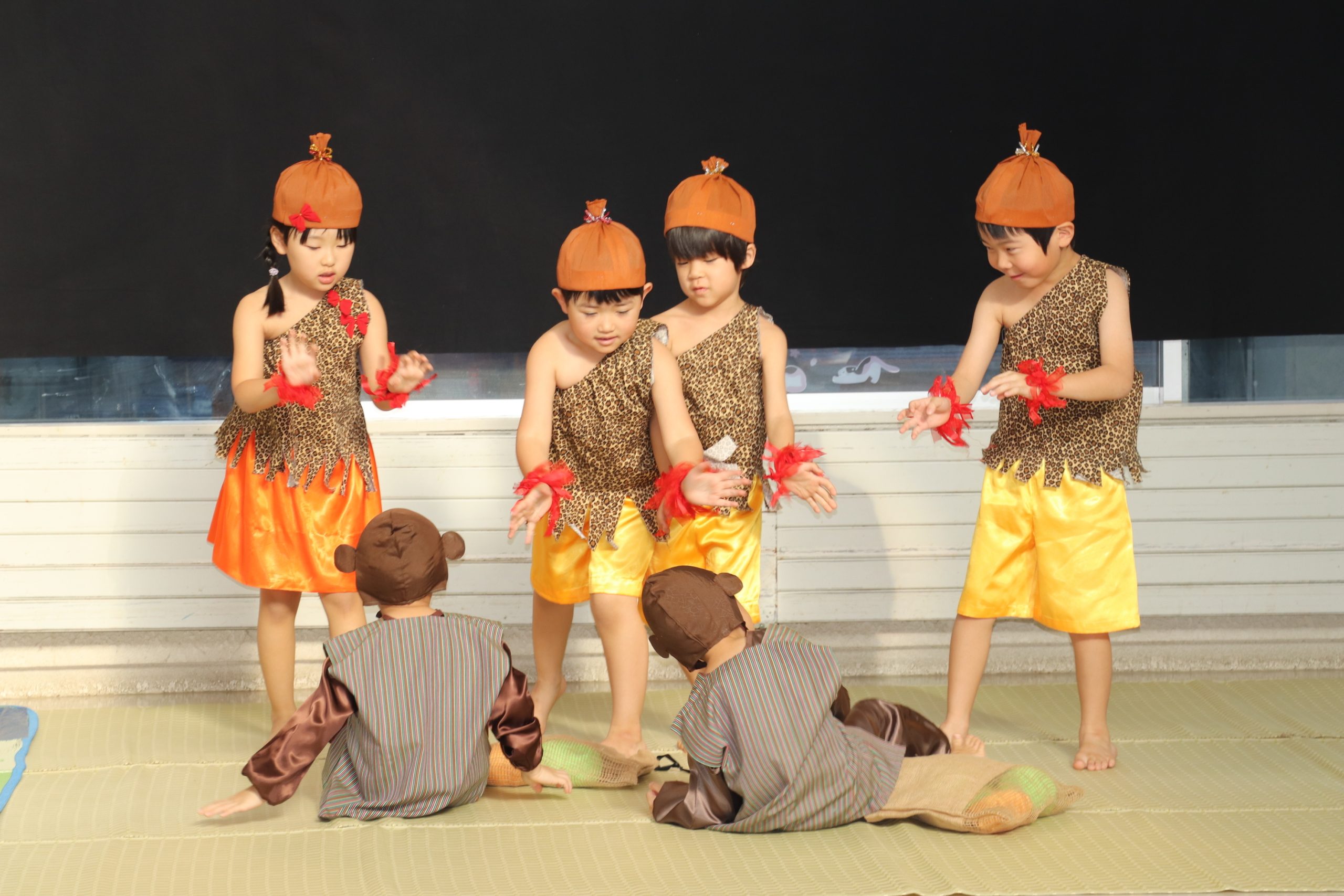 また、5歳児(17人)は、舞踊劇「さるかにむかしばなし」と、歌「森のくまさん」「赤鬼と青鬼のタンゴ」を披露した。舞踊劇では、サル、カニ、クリなどの衣装を身に着けた園児たちが、かわいらしい演技を披露した。