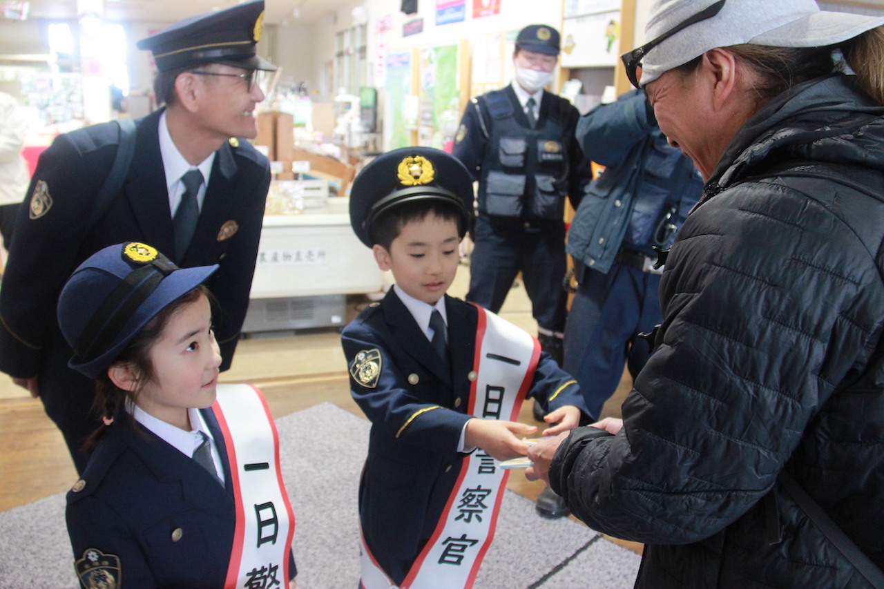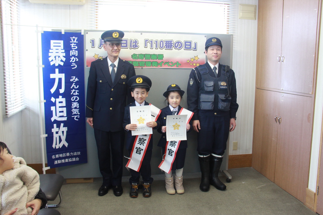 毎年1月10日の「110番の日」で、名寄警察署(米村和信署長)は10日、風連中央小学校1年生の太田真さん、佐藤昊さんを「一日風連駐在所長」に委嘱。太田さん、佐藤さんは道の駅「もち米の里☆なよろ」で啓発活動を行い、正しい110番のかけ方をPRした。
