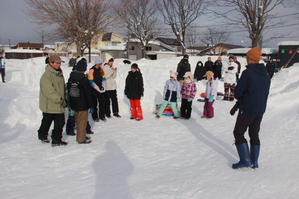 子ども20人ほどが参加。開会で柚留木会長は「今年は雪が少なく、暖かくて会場を作るのに苦労しましたが、役員の頑張りで会場が出来上がりました。今日は天気が良いので、元気に楽しく遊んでほしいです」と挨拶した。
