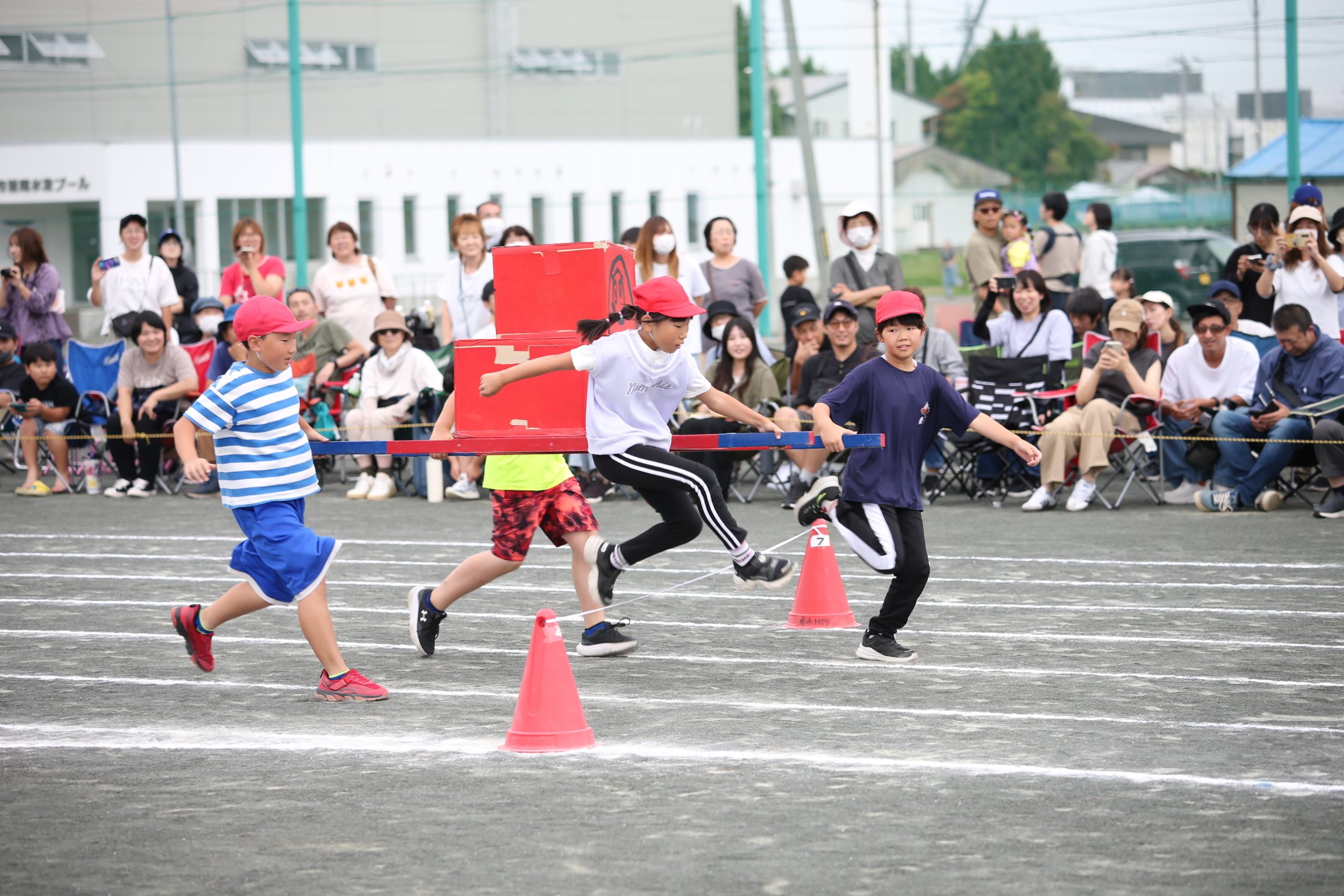 4年生は「パネルDEポン!だるま運びリレー」。だるまを模した箱を2~3段に積み上げて運び、並べ終えるまでの速さを競うもの。箱はパズルになっていて運動会のテーマが現れるが、競技開始まで何が書かれているか分からず、パズル担当の児童は、箱から少し離れて確認したり、並べ直したりしながら完成させた。