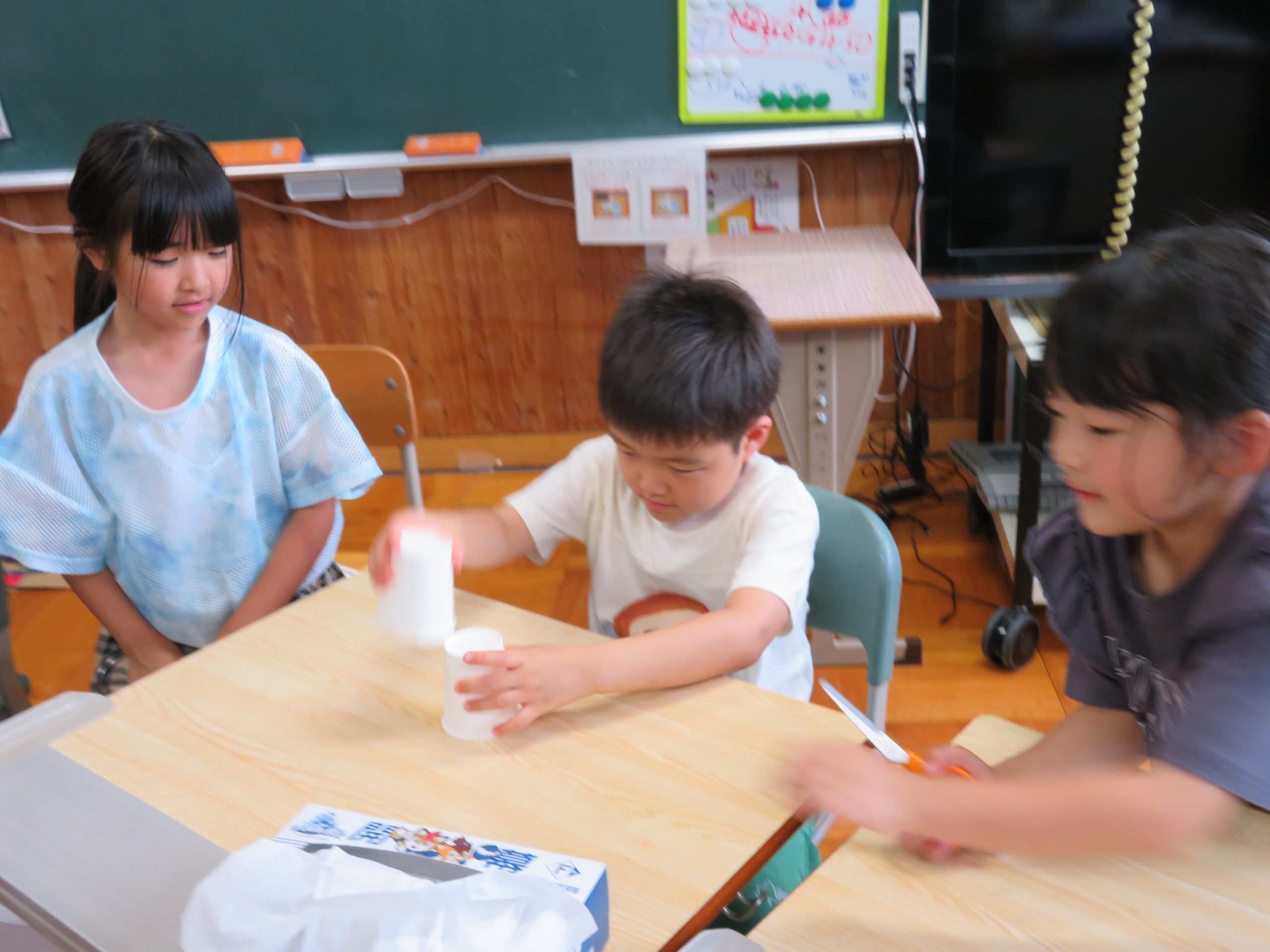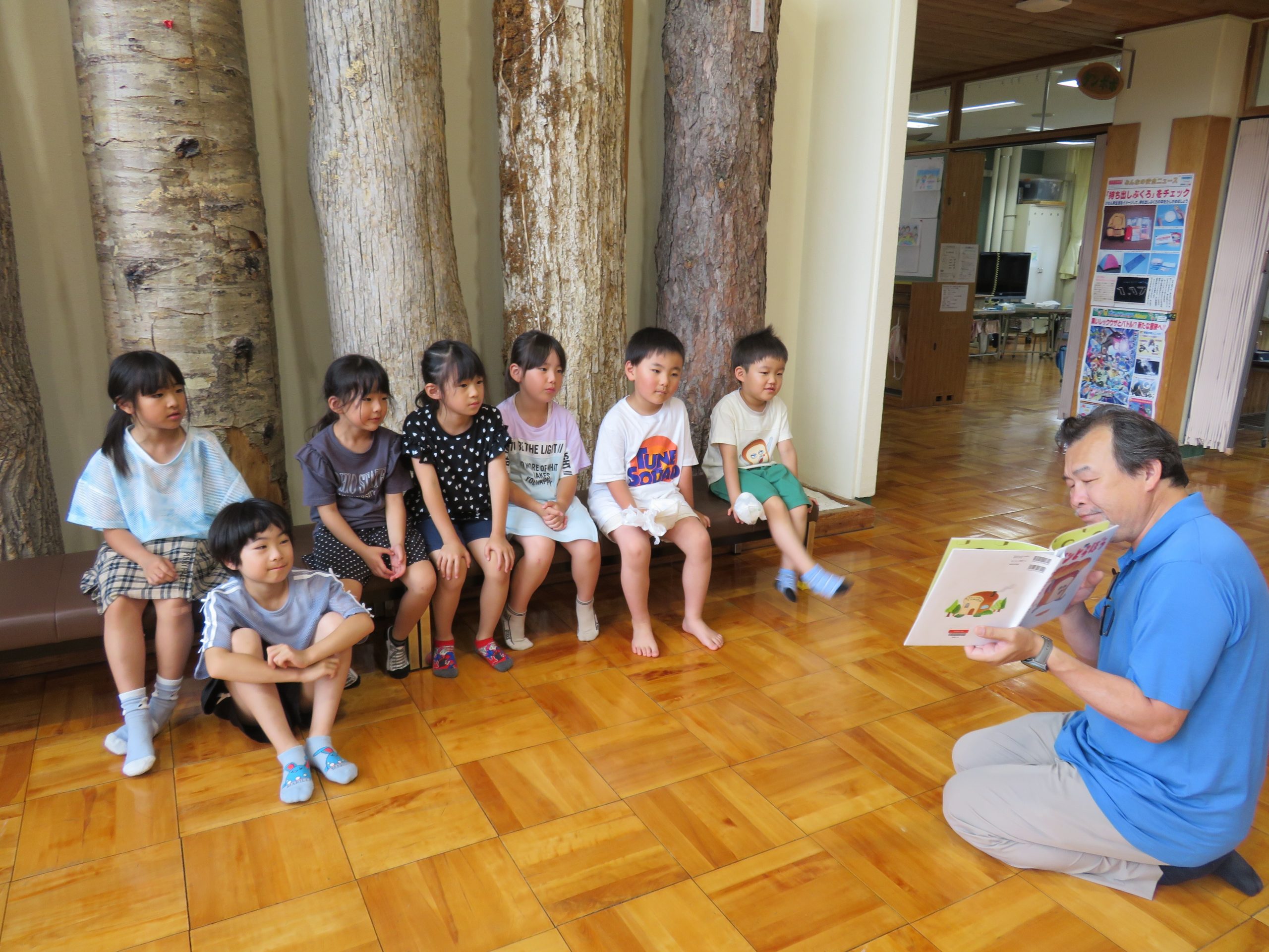 見学会に参加した園児2人は、1・2年生(5人)との交流授業(生活科)に参加。お兄さん、お姉さんの指導を受けながら、ものづくりなどに挑戦。読み聞かせも一緒に受け、時折、笑顔が見られた。