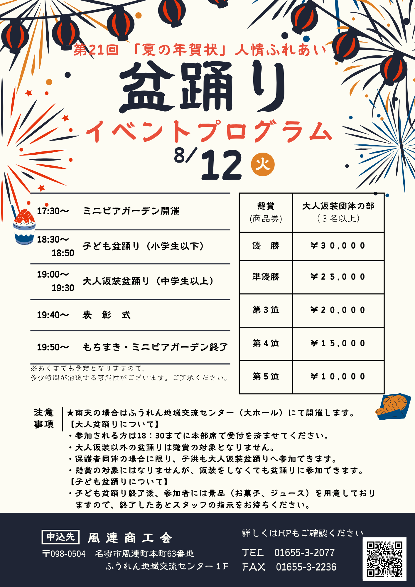申し込み(盆踊り大会) 風連商工会まで。申し込みの際に、チーム名・題目・代表者名・住所・電話番号をお伝え下さい。