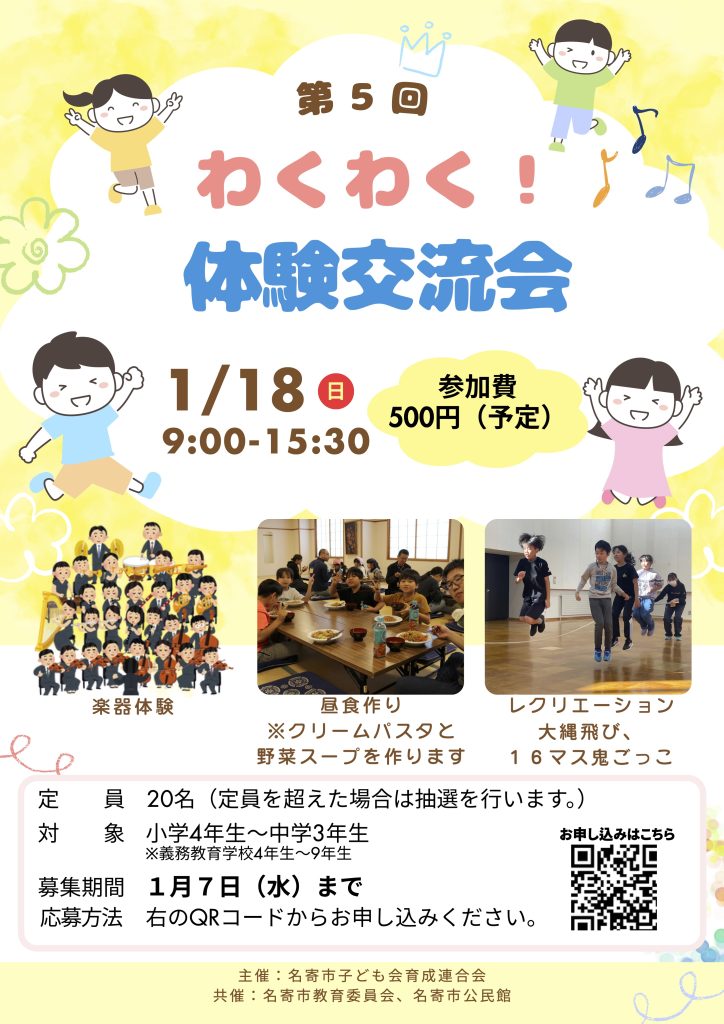 楽器体験、昼食作り、大縄跳びや16マス鬼ごっこなどのレクリエーションが楽しめるこどもたちのための交流会!