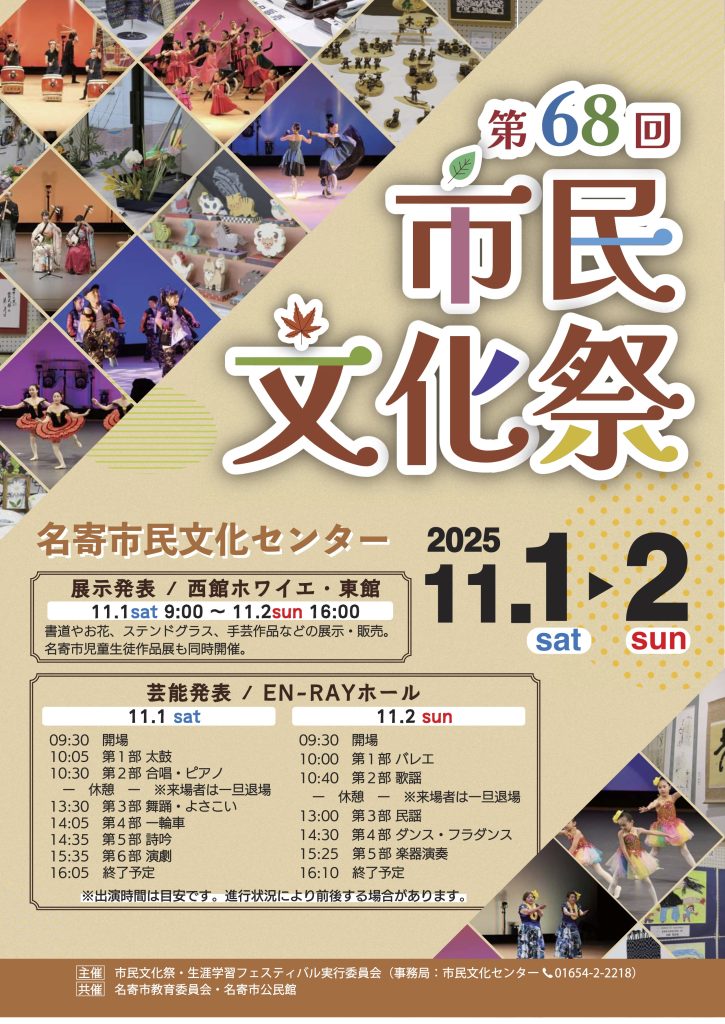 問い合わせ 市民文化祭・生涯学習フェスティバル実行委員会 事務局(名寄市民文化センター内) TEL: 01654-2-2218