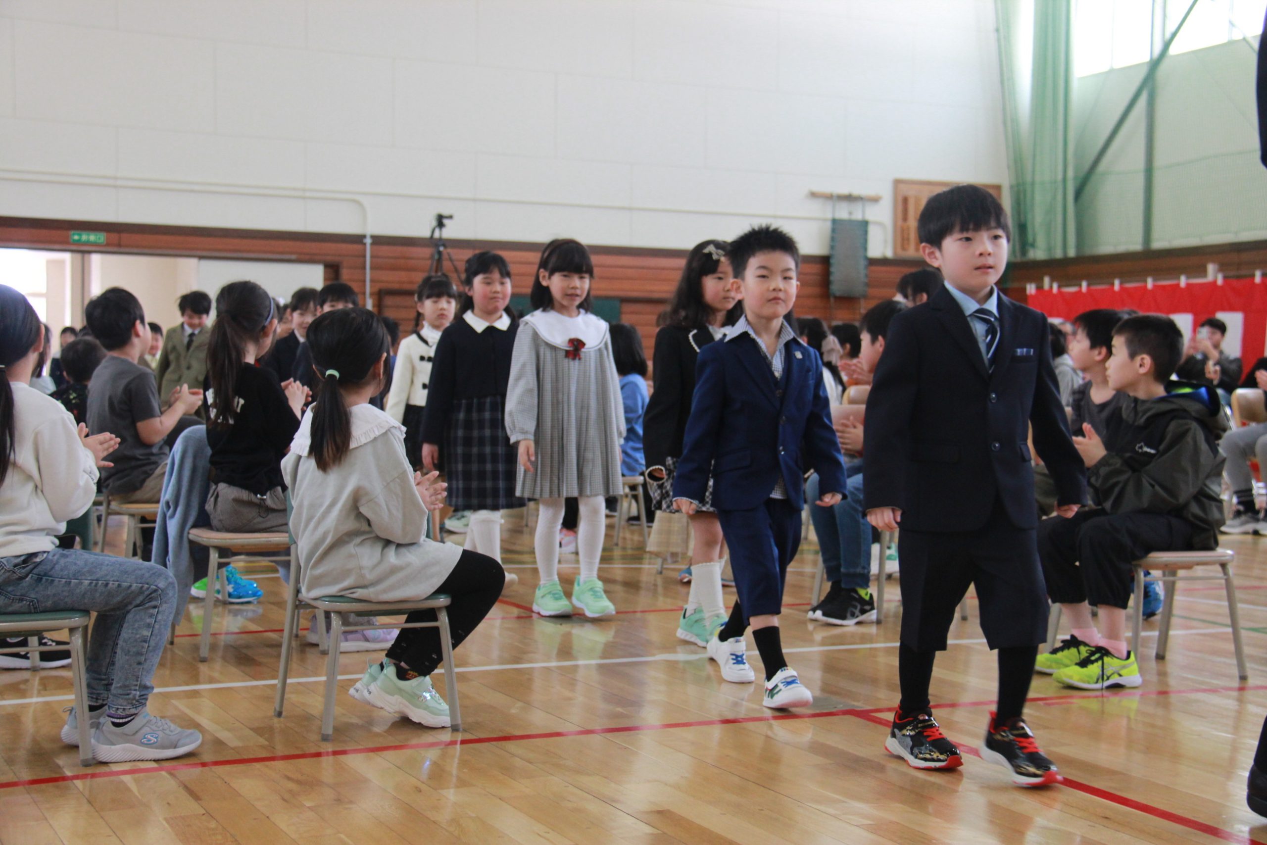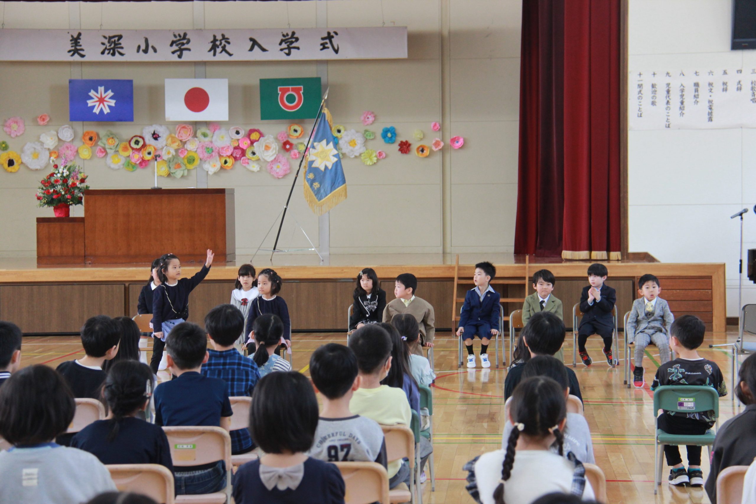 入学児童紹介では、担任の栗本卓哉教諭から名前を呼ばれると、元気よく「はい!」と返事をしていた。