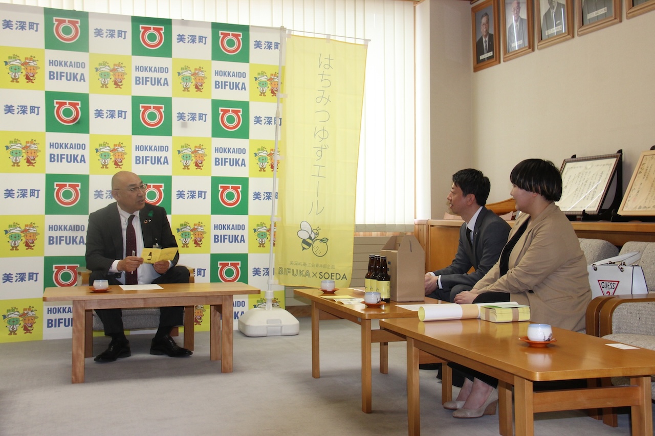美深町商工会青年部(馬場大輔部長)は、美深町産の蜂蜜と姉妹町の福岡県添田町産のユズ(柚子)を使ったクラフトビール「はちみつゆずエール」を開発して製造、5月15日から一般販売を開始する。美深白樺ブルワリー(BSB、大通北4)で製造し、ユズの爽やかな香りと風味、わずかな渋みの蜂蜜の味わいで、すっきりした飲み心地が特徴。馬場部長と久須田麻子副部長が4月24日午後4時に町役場を訪れ、草野孝治町長らに商品を披露した。