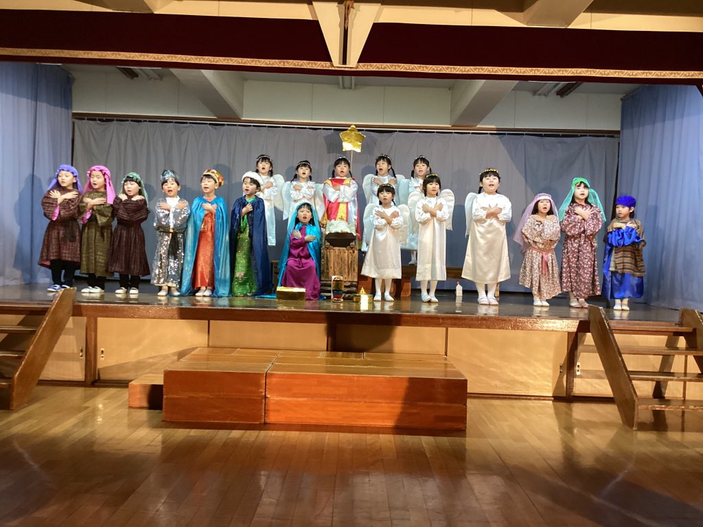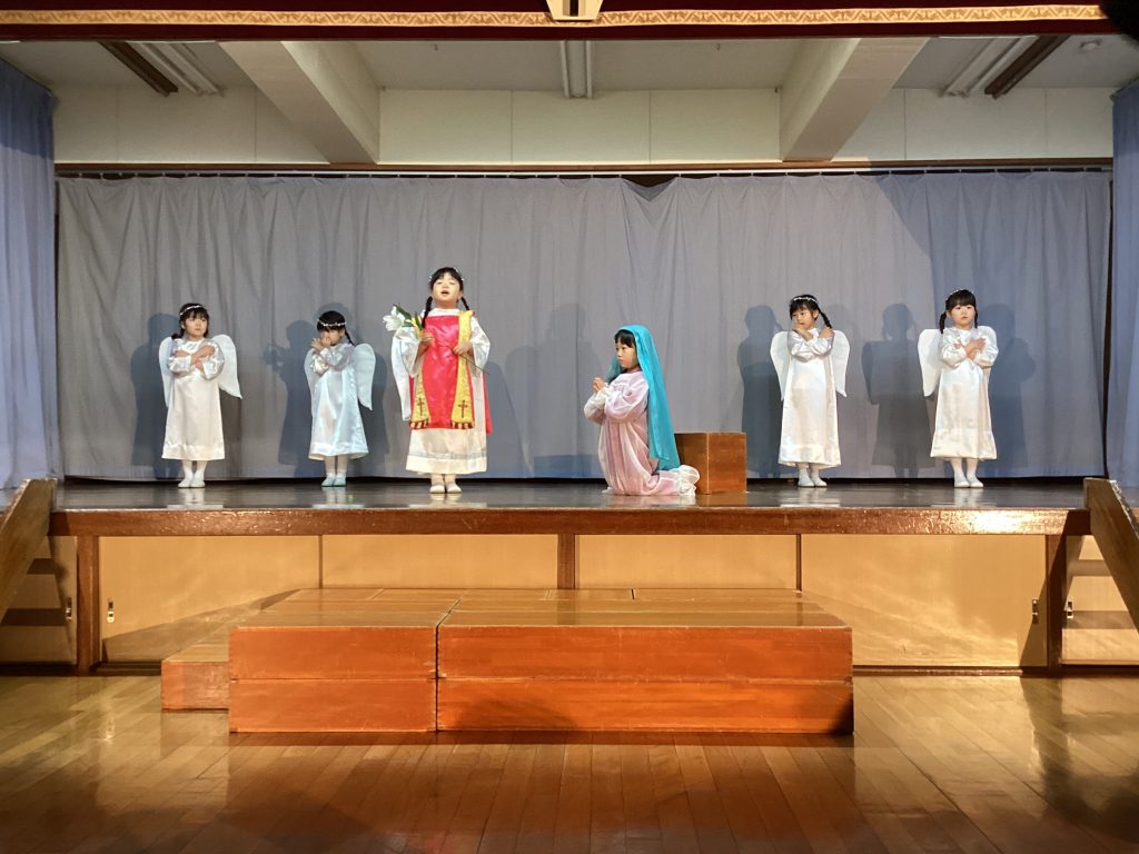 聖劇は、①世界のはじめ(神様がこの世界を作ったこと)②お告げ(大天使がマリア様にお腹の子はイエス様であることを告げたこと)③宿探し(ヨゼフ様とマリア様の宿探しと馬小屋でイエス様を出産したこと)④牧場(救い主が生まれたことを、はじめに羊飼いに伝えたこと)⑤博士(博士たちが、イエス様が生まれた導きの星を目指したこと)で構成。途中、てんちのはじめ、かみさまのおやくそく、おめでとうマリア、グローリアなどの歌を交えながら演じた。