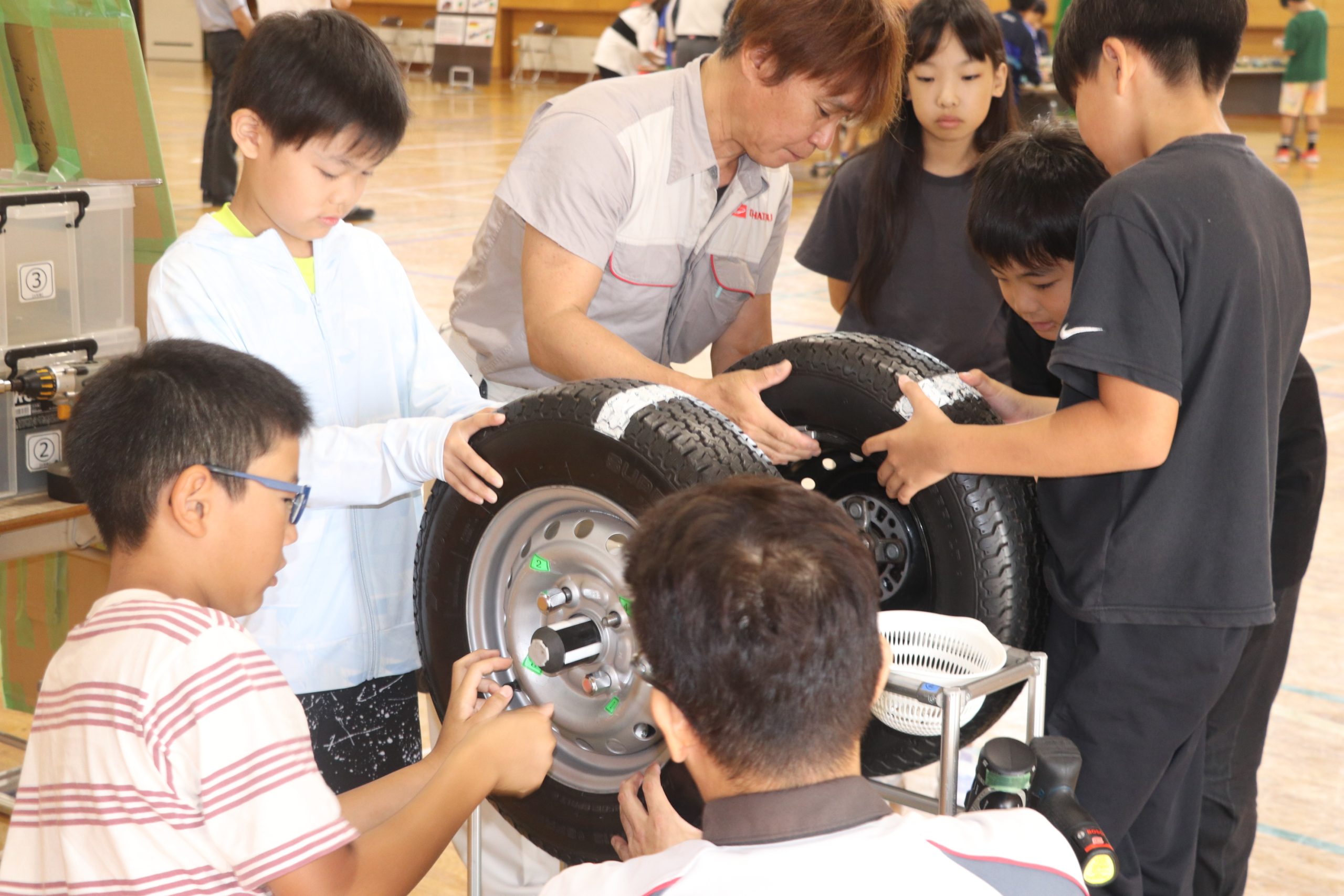 プレス工程、溶接工程では「プレスに必要な力は500t」「鉄板で作られたものを電気でつなげる時間は0・2秒」などと教えられ、プレス機を用いて、ダイハツの缶バッジを作成。組み立てコーナーでは、実際のタイヤのボルトを電動工具で締める体験も行った。