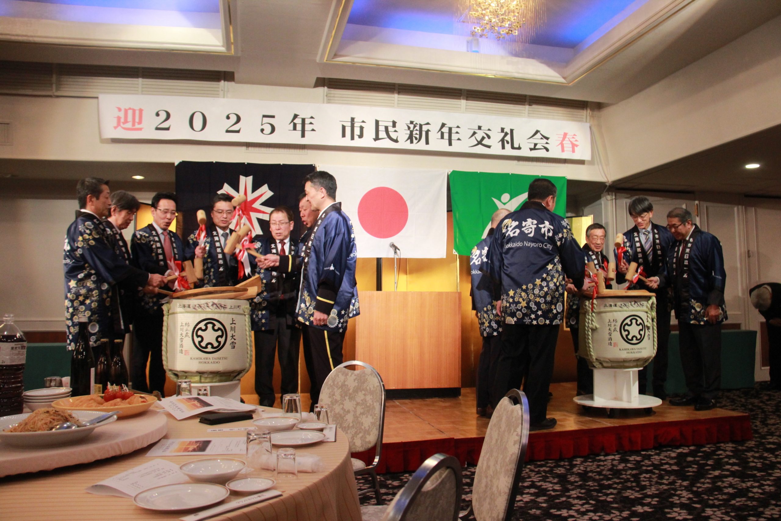 加藤剛士市長、山田典幸市議会議長、中野秀敏道議会議員、藤田健慈名寄商工会議所会頭、中尾公一風連商工会長、村上清道北なよろ農協組合長、藤田明大陸上自衛隊名寄駐屯地司令らが鏡割りを行い、新年を祝った。
