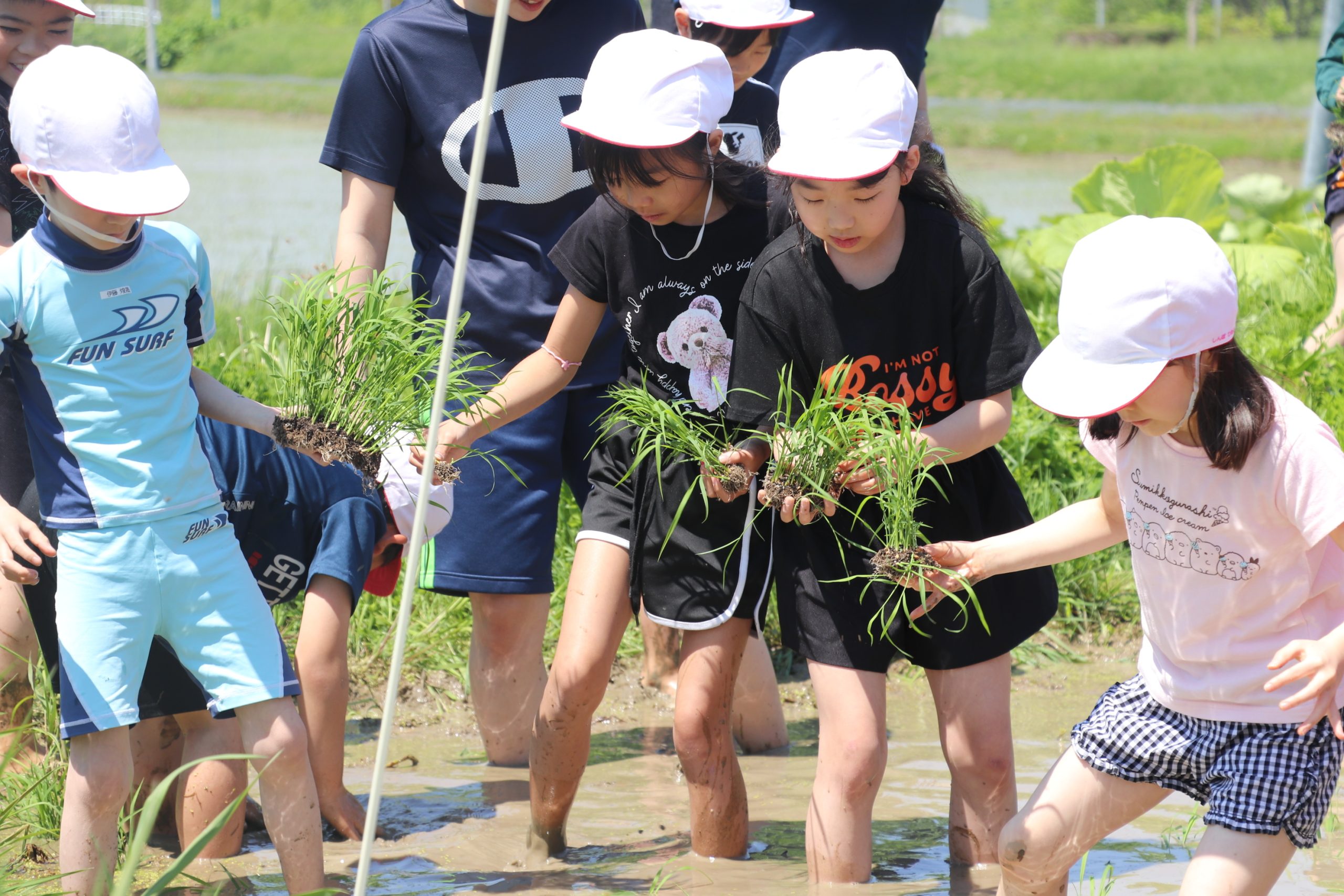 児童たちは「キャー」「わー」「痛い」「冷たい」などと声を上げながら裸足で水田の中に入り、田植えを始めると「水は冷たくない」「楽しい」などの声も聞かれた。