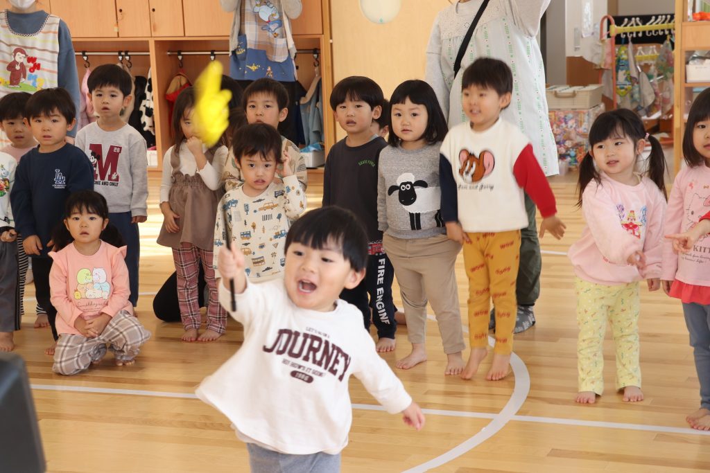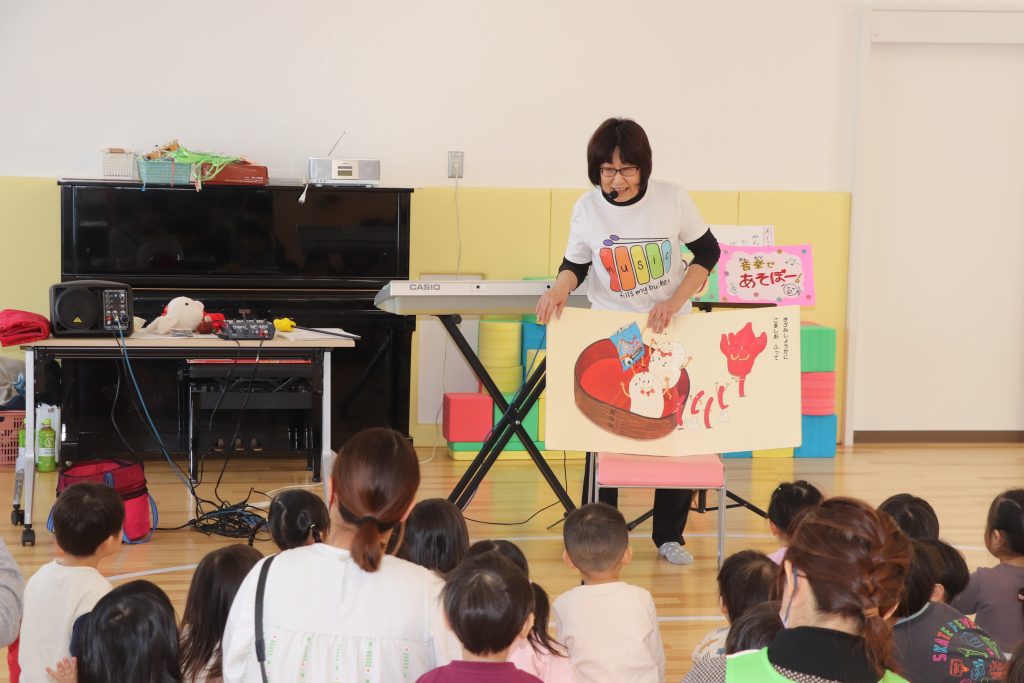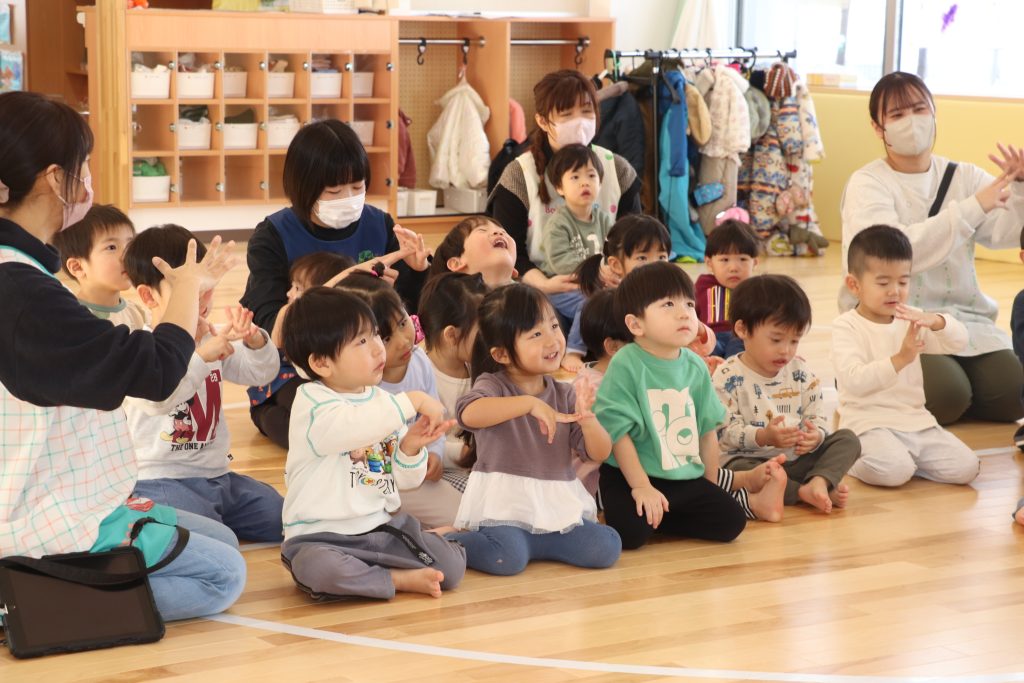「グーチョキパーでなにつくろう」では、保育士と園児が一体となって、手遊びで動物などをまねて作り、絵本と一緒に、「おべんとうばこのうた」も歌った。