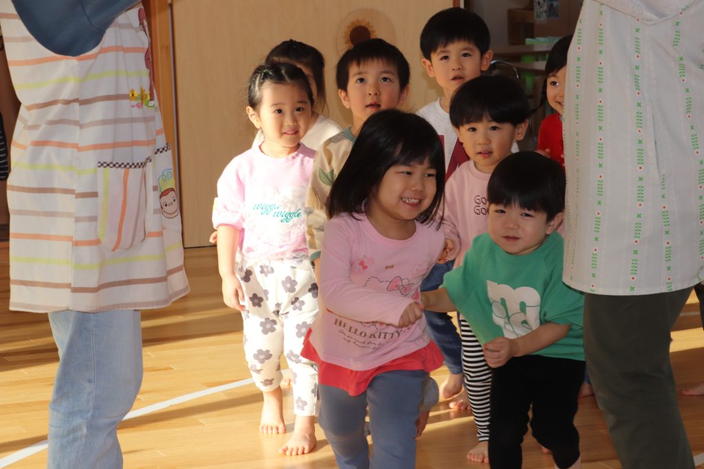 「ロンドン橋」では、始めは保育士が橋を作っていたが、後半は園児同士で橋を作り、大喜びで橋の中をくぐっていた。