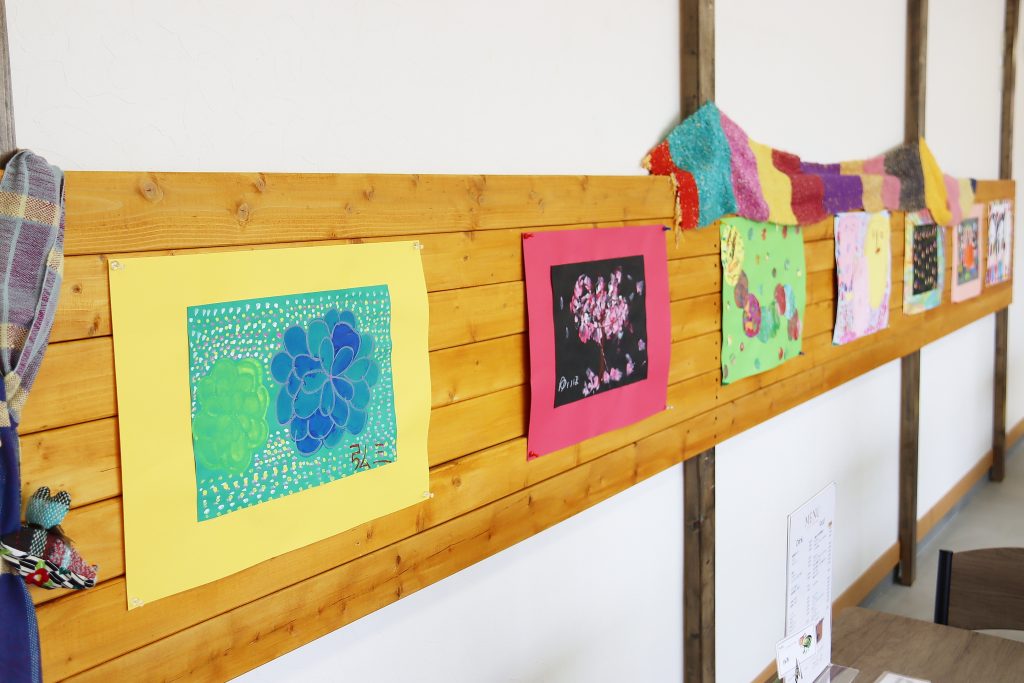作品展は、同カフェを運営する道北センター福祉会の主催。カフェのスペースを会場に、障がいのある人が製作したアート作品を展示しているもの。