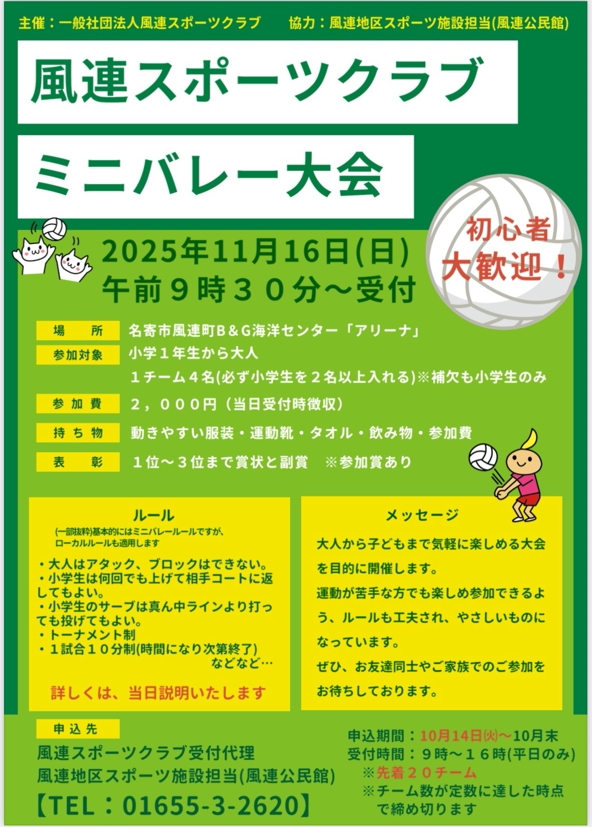 申し込み 風連スポーツクラブ受付代理 風連地区スポーツ施設担当(風連公民館) TEL: 01655-3-2620