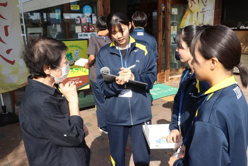 風連中学校(石本義行校長)の3年生22人は、3日午後1時20分から道の駅「もち米の里☆なよろ」で、利用者に対してアンケート調査を行った。